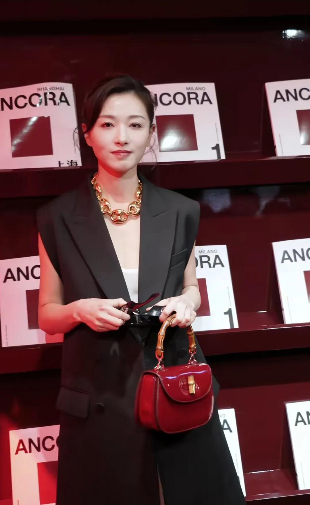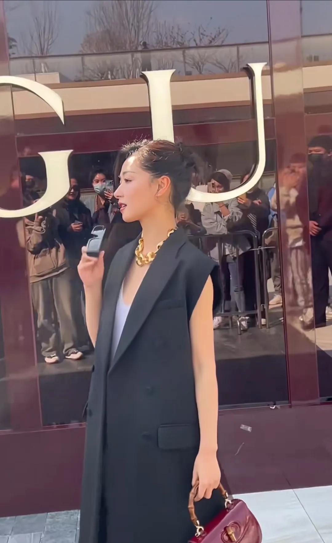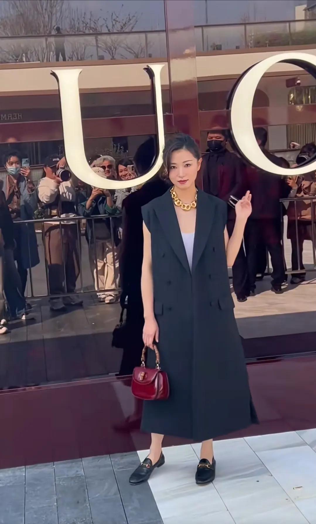 万茜在成都skp参加古驰活动,穿无袖西装外套的万茜看起来又酷又飒,她的服装和造型