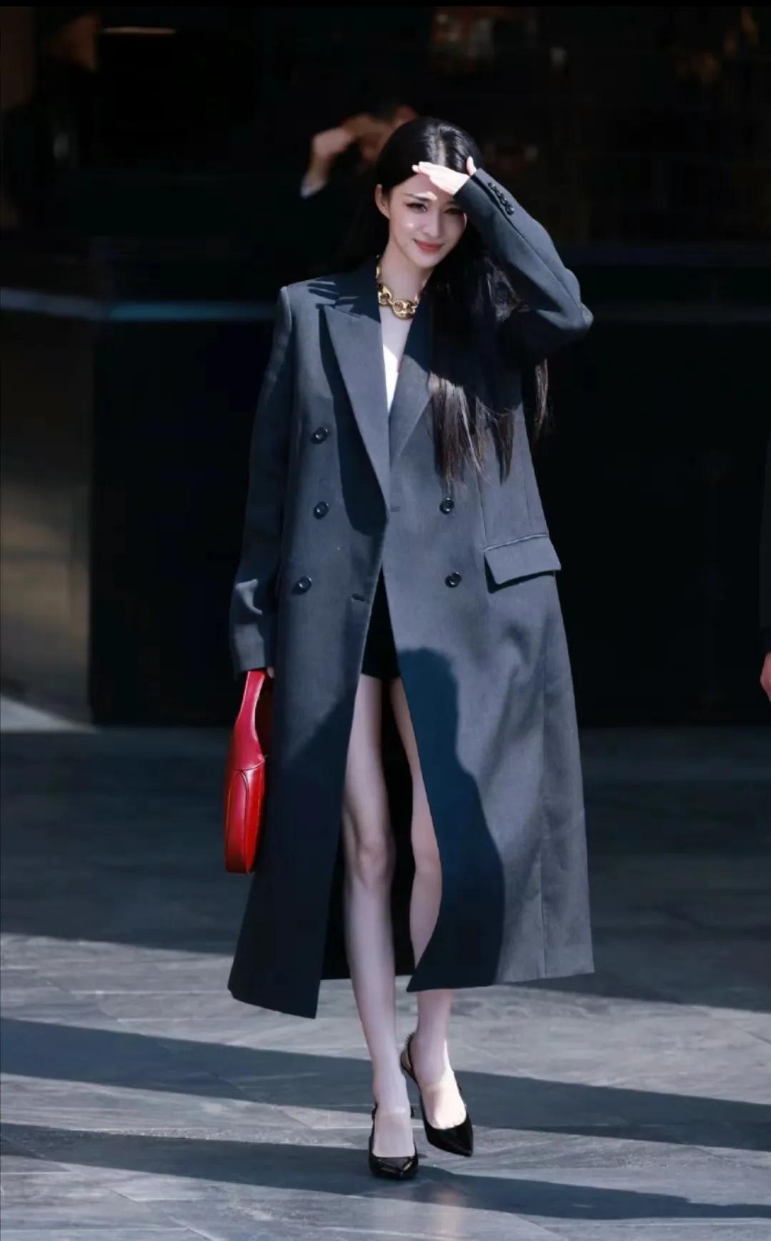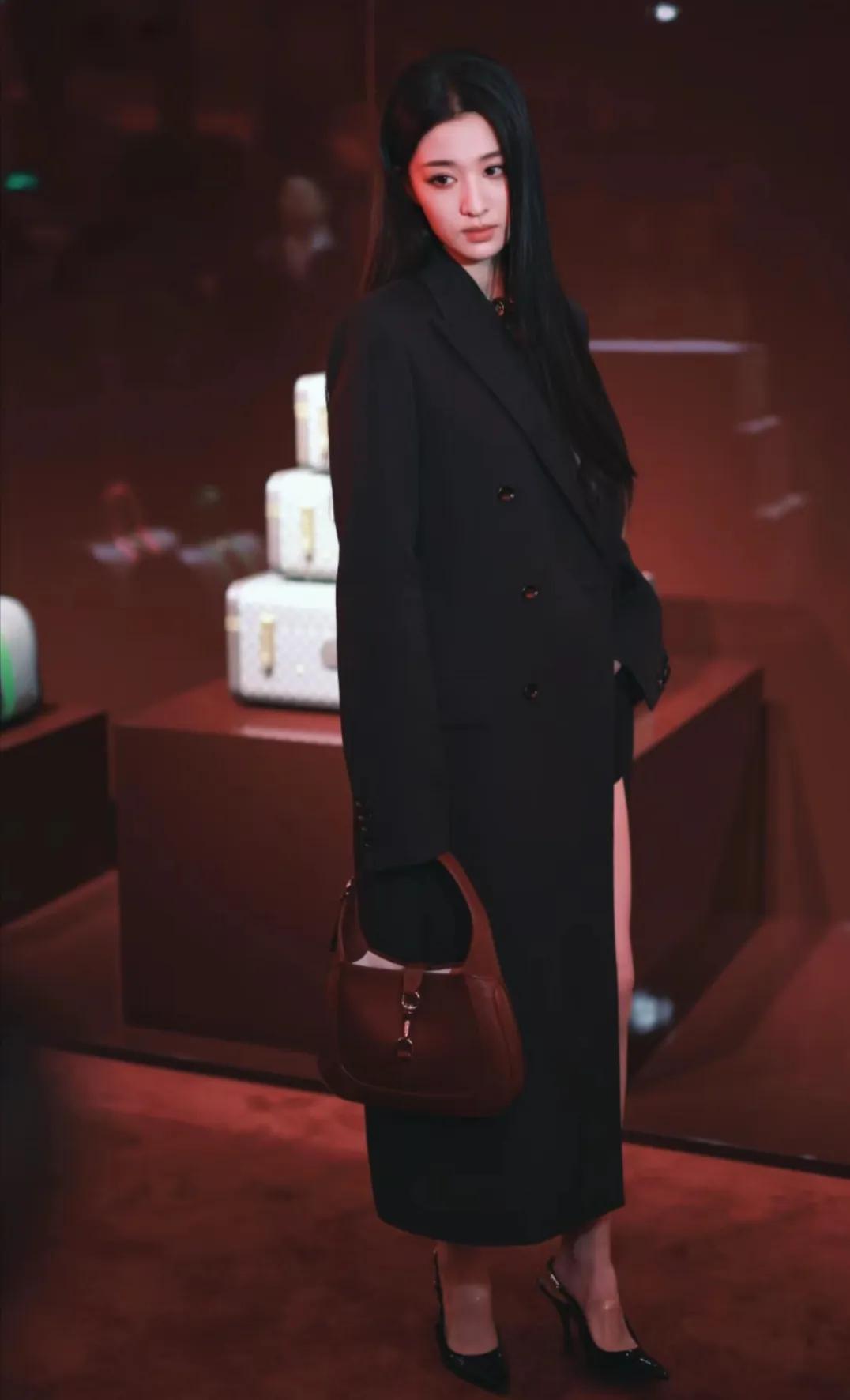 王楚然古驰活动黑色大衣造型好酷好飒啊! 她的硬件在95花里真的前排,个子高腿长身