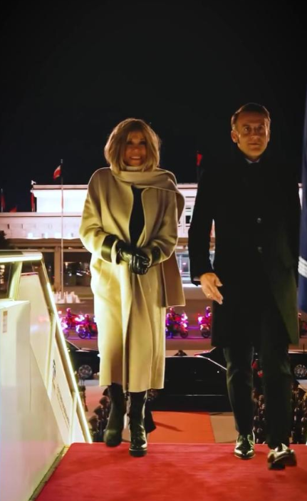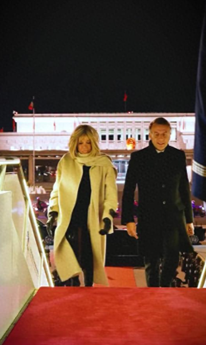 回顾马克龙夫妇抵达北京的机场照,法国夫人布里吉特是穿着中国红风衣,内搭是黑色上衣与黑裤,鞋子也是黑色的;反观夫人回国机场照,也就换了风衣而已,脖子里多了一条围巾还有手套,内搭与鞋子是一样的。
