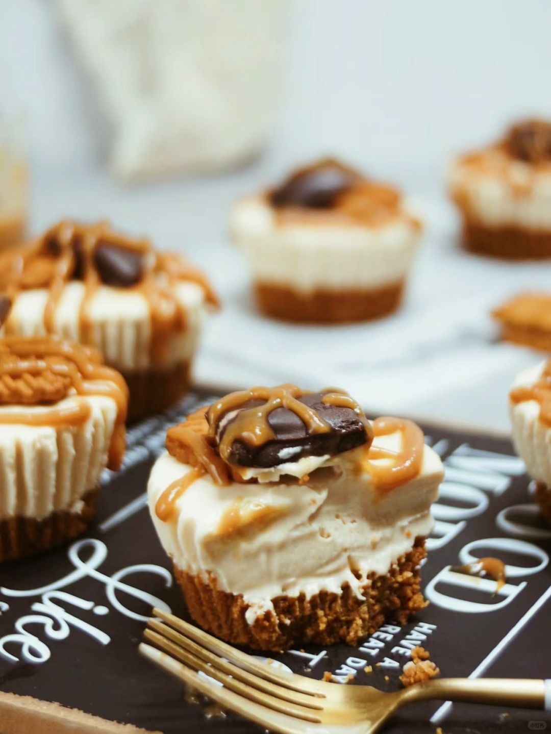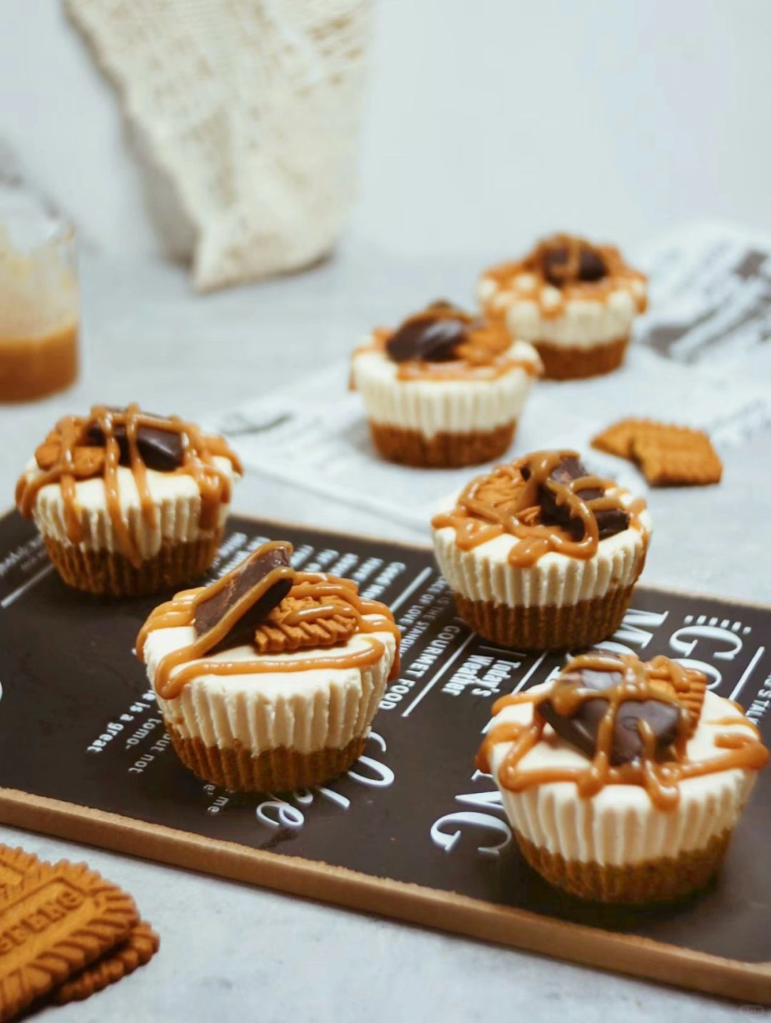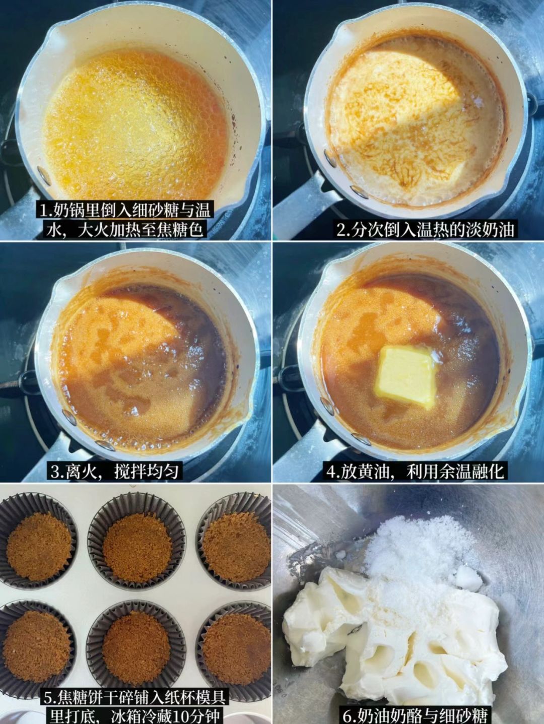 我的烘焙日常 焦糖饼干打底,微苦香甜的焦糖酱与奶酪糊搭配的恰到好处。搅一搅,拌一拌,放入冰箱冷冻,淋上浓稠的海盐焦糖酱。细腻顺滑,层次丰富,新手也能成功哦。 · 👩🏻‍🍳【配方:】 焦糖饼干100g 黄油40g 焦糖酱:细砂糖80g 温水20g 淡奶油110g 黄油20g 芝士糊:焦糖酱60g 奶油奶酪227g 淡奶油70g 细砂糖30g · 👩🏻‍🍳【步骤:】 1️⃣饼干碾碎与融化的黄油翻拌均匀,倒入纸杯托里,压平放入冰箱冷藏 2️⃣奶锅里倒入细砂糖和温水,中火熬煮到想要的琥珀色,离火以后缓慢倒入温热的淡奶油,继续小火加热,熬煮浓稠以后就可以离火。 3️⃣放黄油,利用余温,搅拌均匀融化,放凉备用 4️⃣奶油奶酪与30g细砂糖搅拌均匀顺滑,加入焦糖酱,搅拌均匀以后,加入打发浓稠的淡奶油,继续搅拌均匀。 5️⃣装入裱花袋,挤入纸杯托里,倒入模具里。冰箱冷冻过夜 6️⃣撕掉纸杯,淋上焦糖酱进行装饰 · ⚠️熬煮焦糖的时候,轻晃奶锅就可以,不要搅拌糖水,避免反砂。这款芝士蛋糕没有吉利丁,需要冷冻凝固