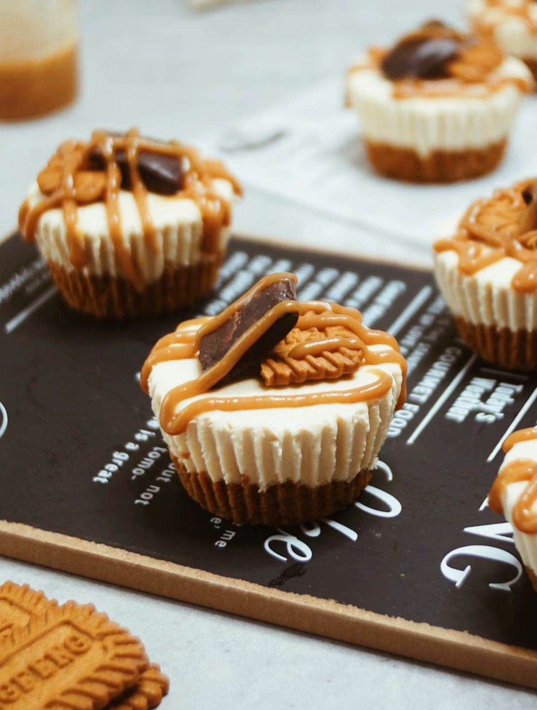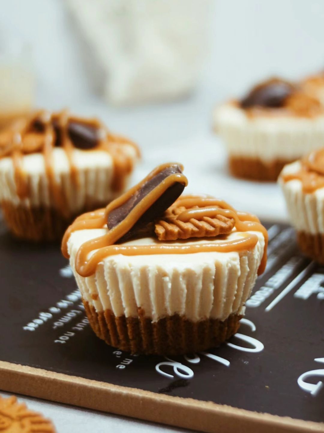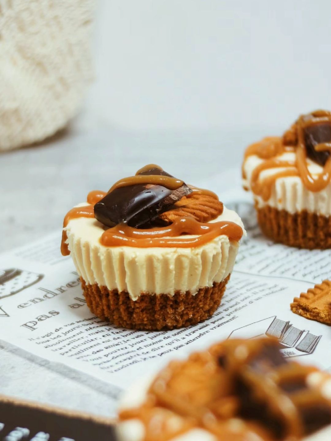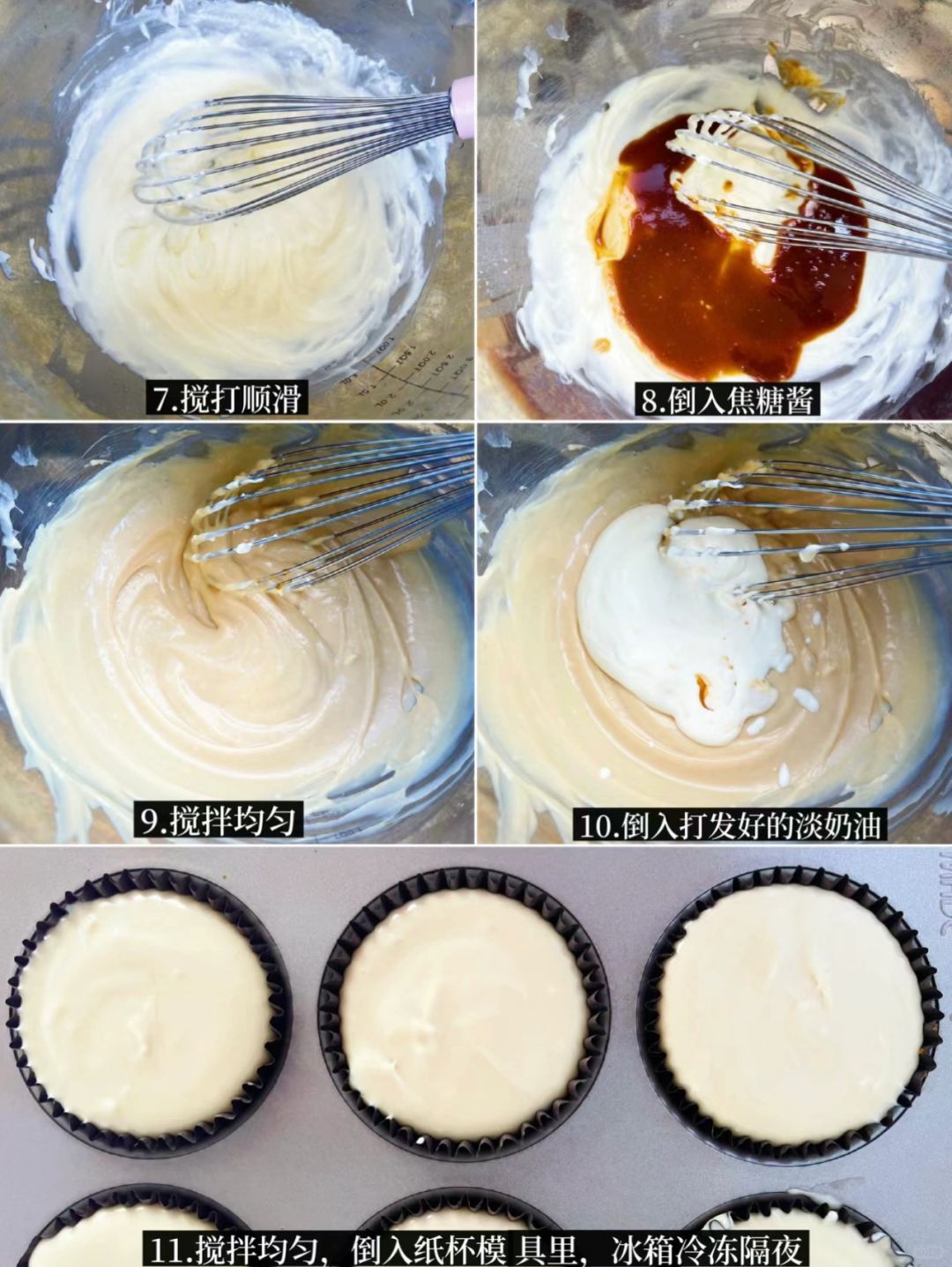 我的烘焙日常 焦糖饼干打底,微苦香甜的焦糖酱与奶酪糊搭配的恰到好处。搅一搅,拌一拌,放入冰箱冷冻,淋上浓稠的海盐焦糖酱。细腻顺滑,层次丰富,新手也能成功哦。 · 👩🏻‍🍳【配方:】 焦糖饼干100g 黄油40g 焦糖酱:细砂糖80g 温水20g 淡奶油110g 黄油20g 芝士糊:焦糖酱60g 奶油奶酪227g 淡奶油70g 细砂糖30g · 👩🏻‍🍳【步骤:】 1️⃣饼干碾碎与融化的黄油翻拌均匀,倒入纸杯托里,压平放入冰箱冷藏 2️⃣奶锅里倒入细砂糖和温水,中火熬煮到想要的琥珀色,离火以后缓慢倒入温热的淡奶油,继续小火加热,熬煮浓稠以后就可以离火。 3️⃣放黄油,利用余温,搅拌均匀融化,放凉备用 4️⃣奶油奶酪与30g细砂糖搅拌均匀顺滑,加入焦糖酱,搅拌均匀以后,加入打发浓稠的淡奶油,继续搅拌均匀。 5️⃣装入裱花袋,挤入纸杯托里,倒入模具里。冰箱冷冻过夜 6️⃣撕掉纸杯,淋上焦糖酱进行装饰 · ⚠️熬煮焦糖的时候,轻晃奶锅就可以,不要搅拌糖水,避免反砂。这款芝士蛋糕没有吉利丁,需要冷冻凝固