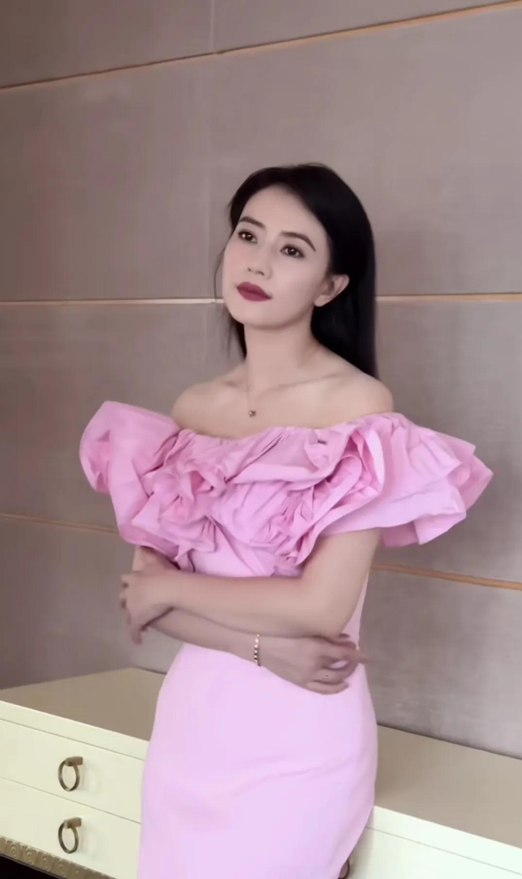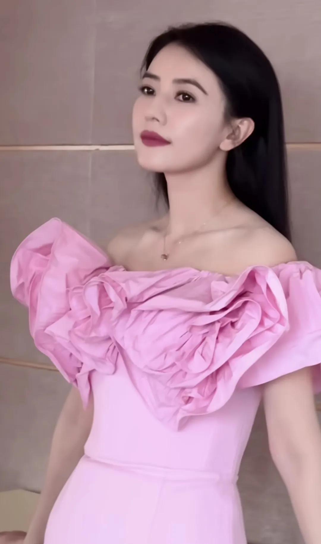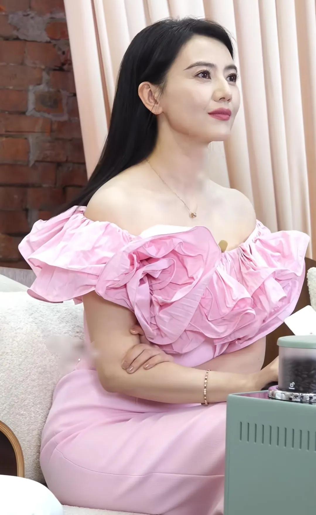 高圆圆最新活动造型,粉色花朵连衣裙好有春天的气息,这个拍摄好真实,高圆圆脸上的皱