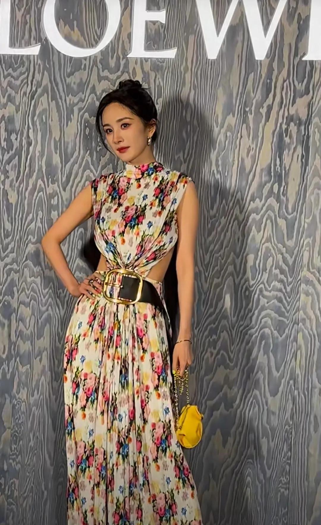 杨幂最新造型碎花裙好美呀,妆容舒服大气 整体状态真的很赞, 拎着小象包如灵狐出