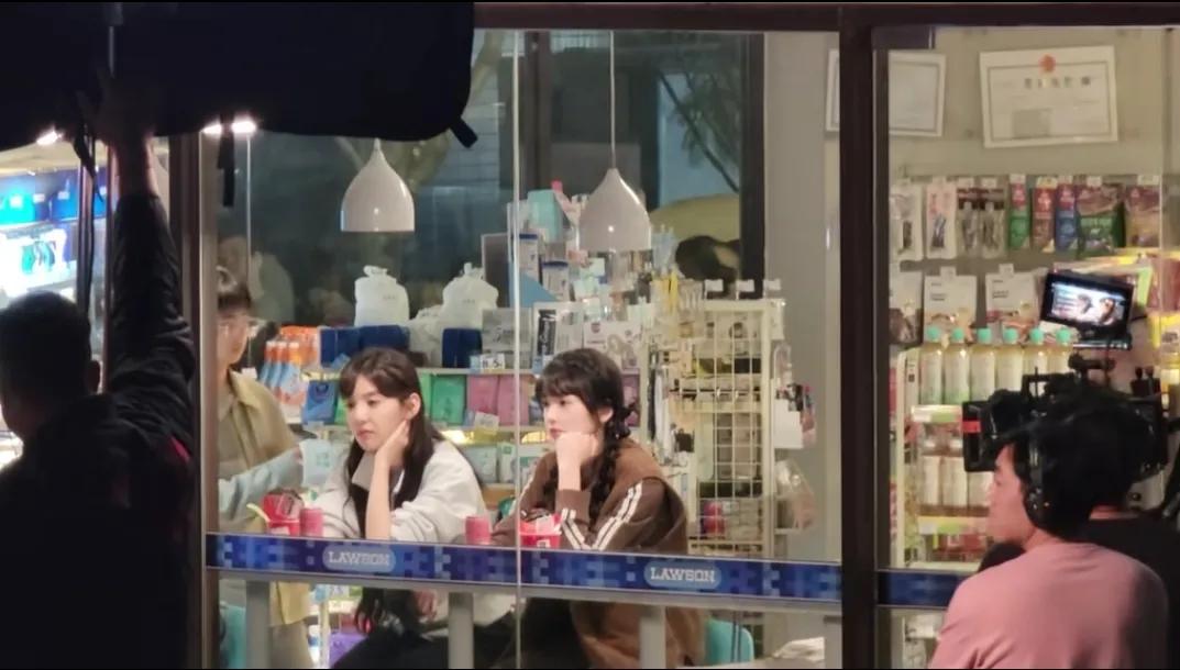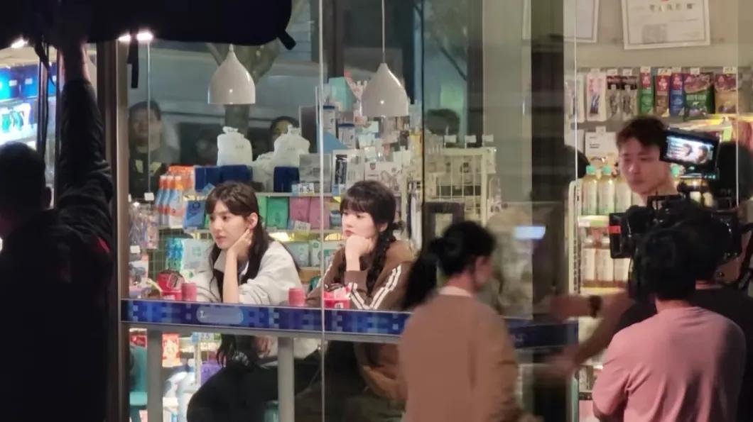 重庆鲤鱼池附近偶遇章若楠和张淼怡拍摄《难哄》电视剧,两个人坐在店里的靠窗位置,托