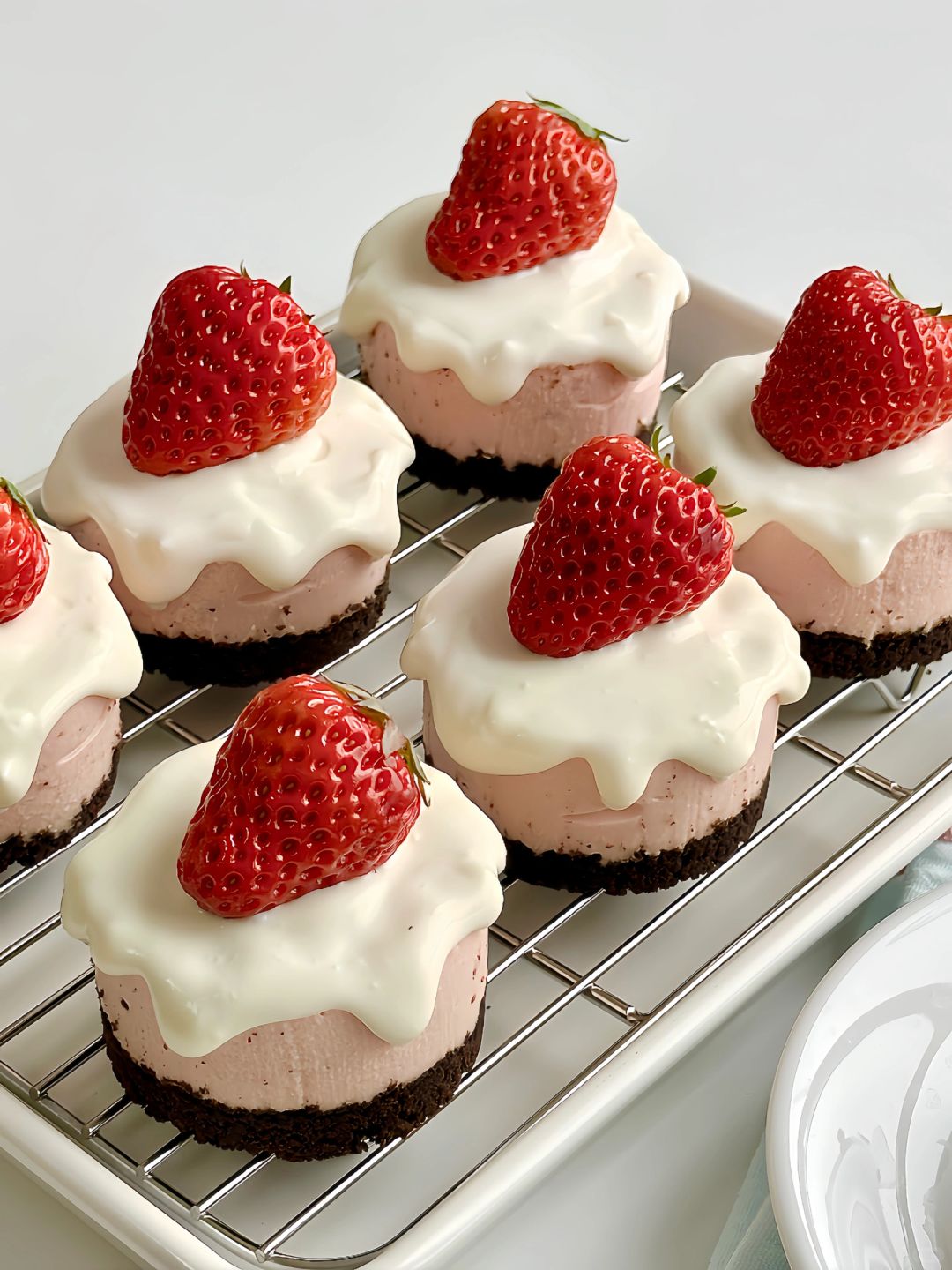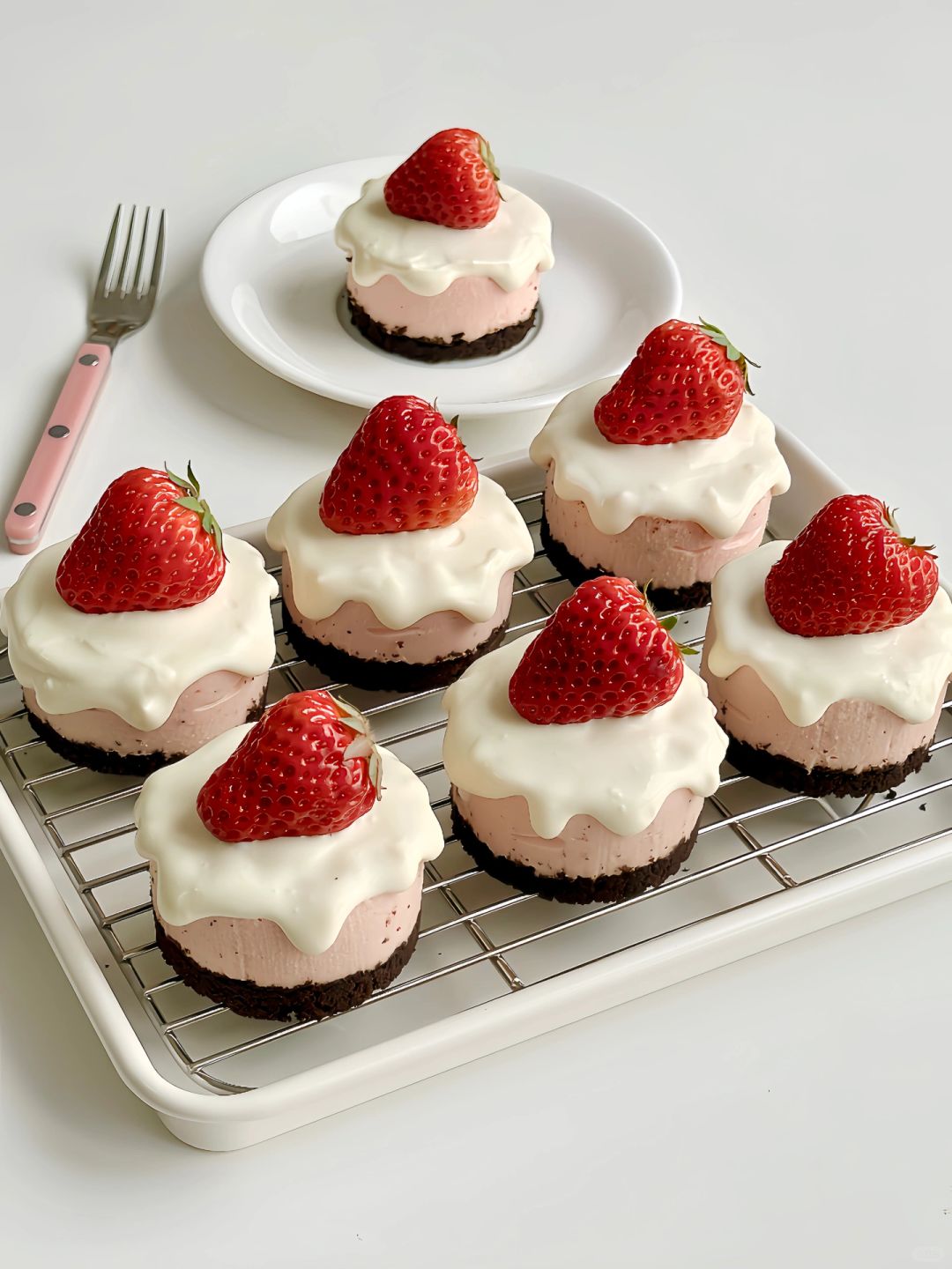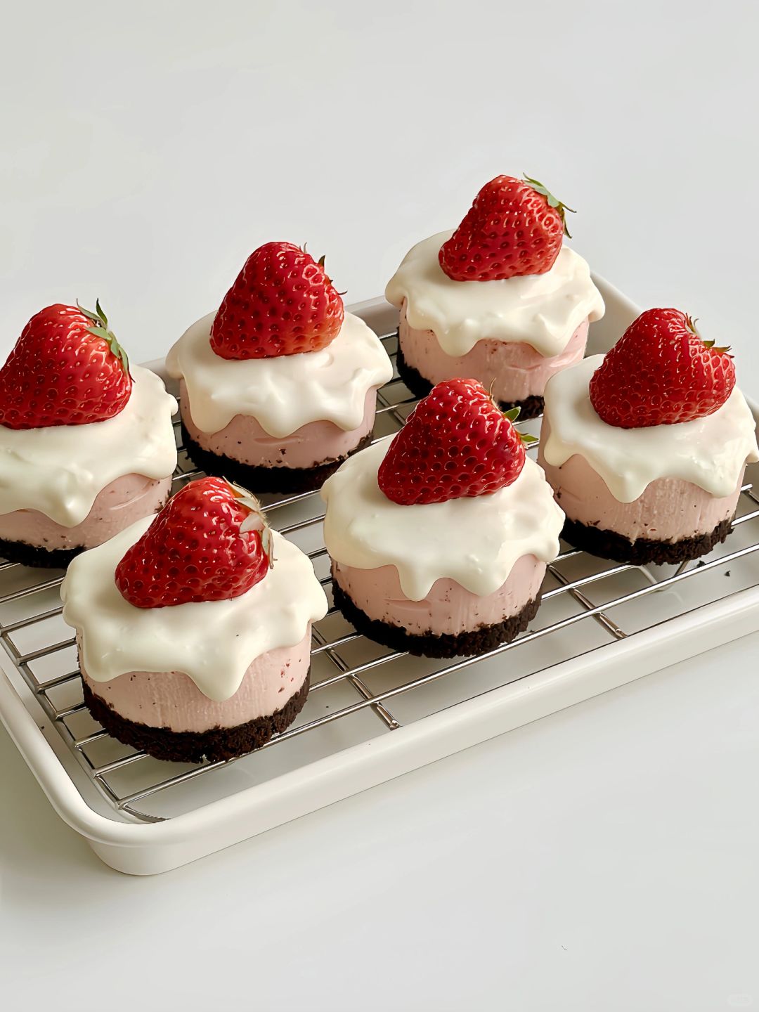 ❹倒入淡奶油混合均匀,再放入🫗草莓酱混合均匀(可放1滴红丝绒液)装裱花袋挤入饼干底模具,送入冰箱冷藏❄️4小时左右脱模
