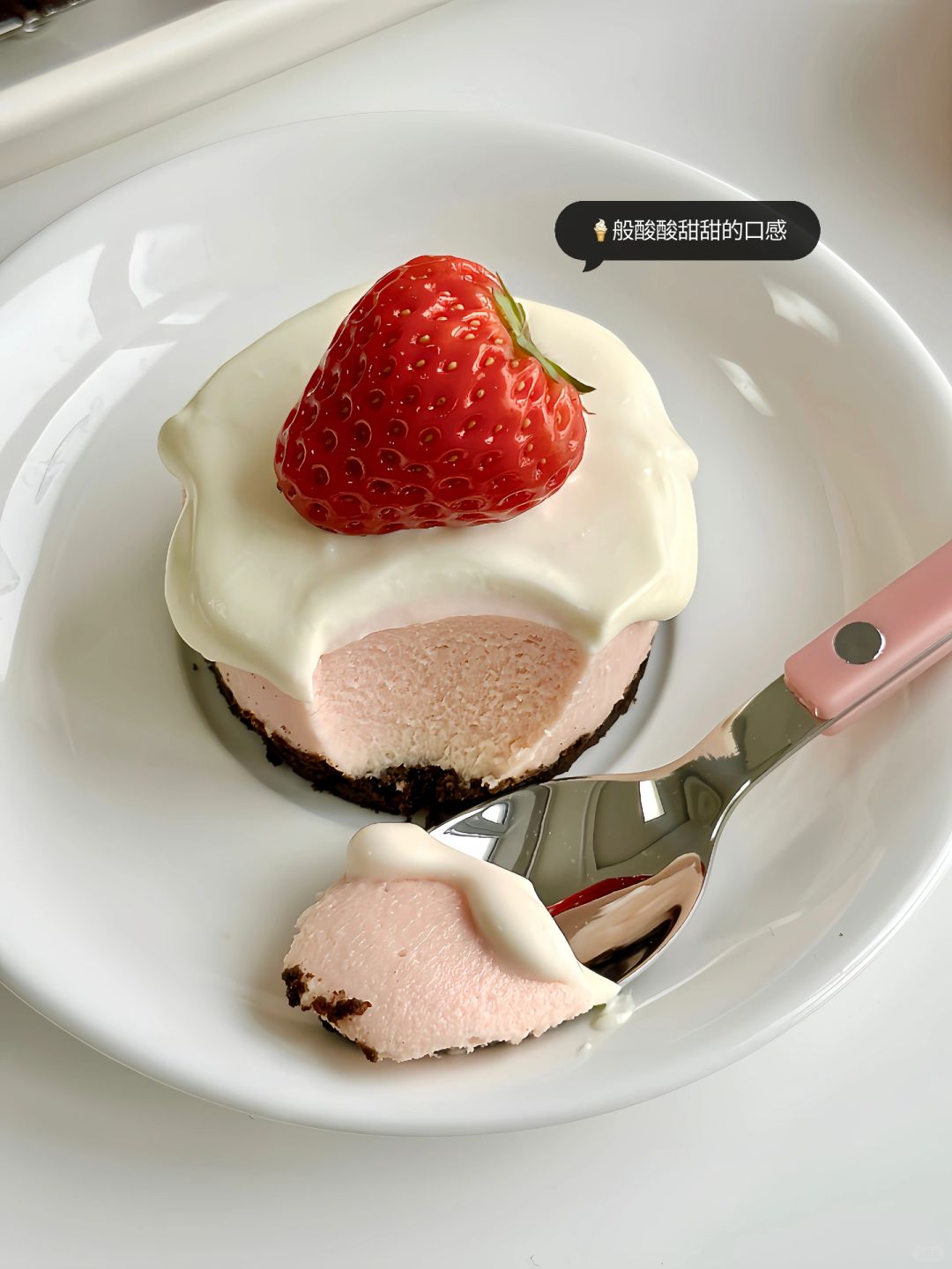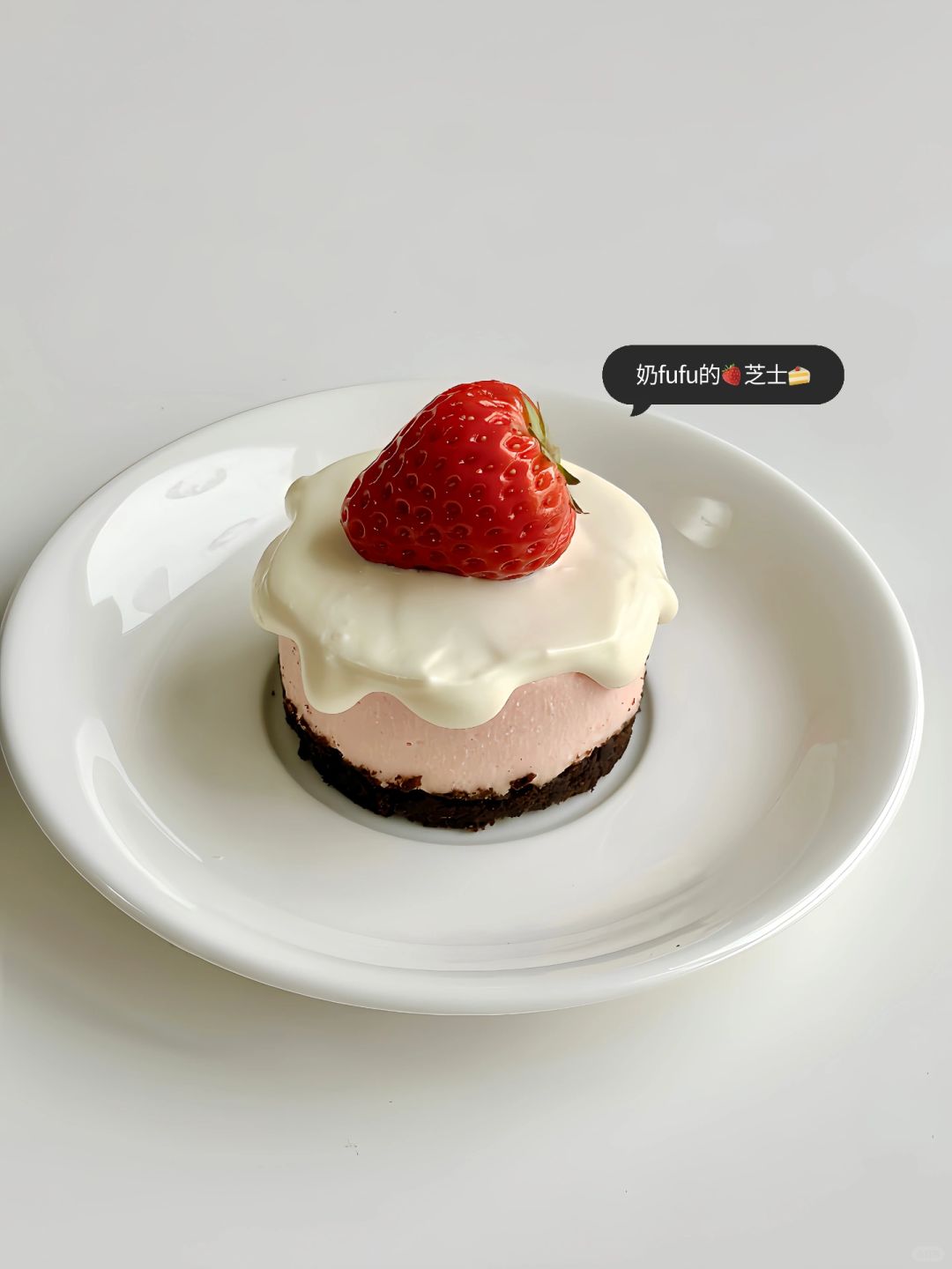 ❺奶盖食材中的奶油奶酪➕糖➕淡奶油混合均匀,再倒入适量牛奶调成酸奶状,抹在蛋糕上,然后用草莓🍓装饰即可