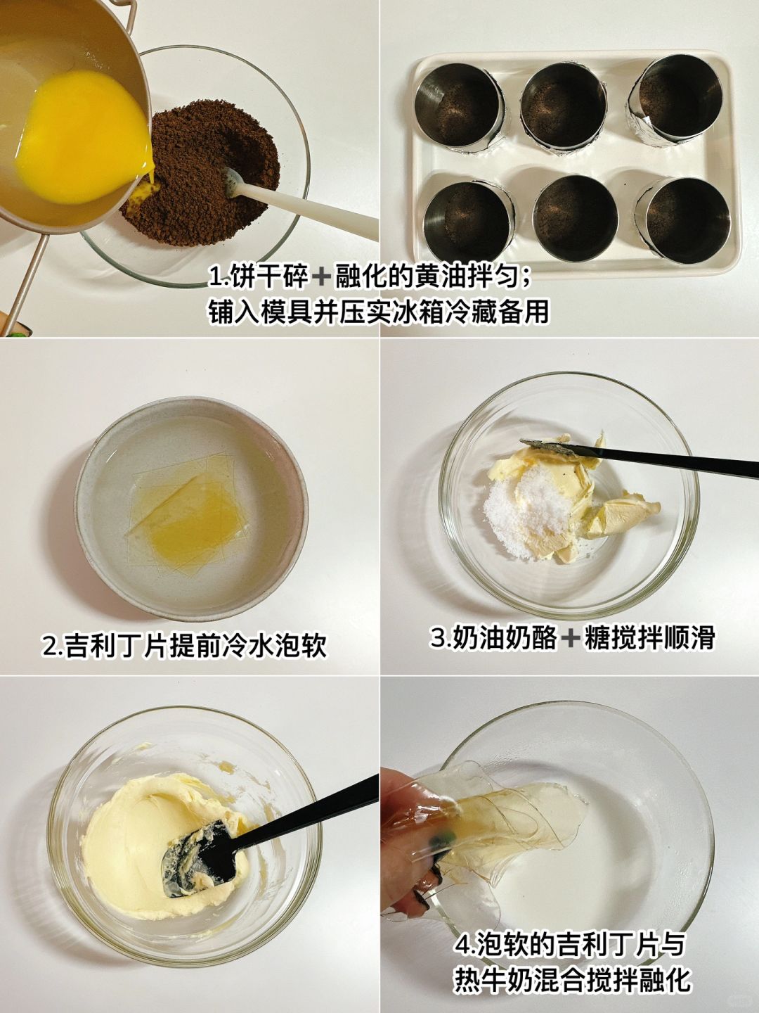 ❶饼干碎➕融化的黄油拌匀,压入模具冰箱冷藏备用