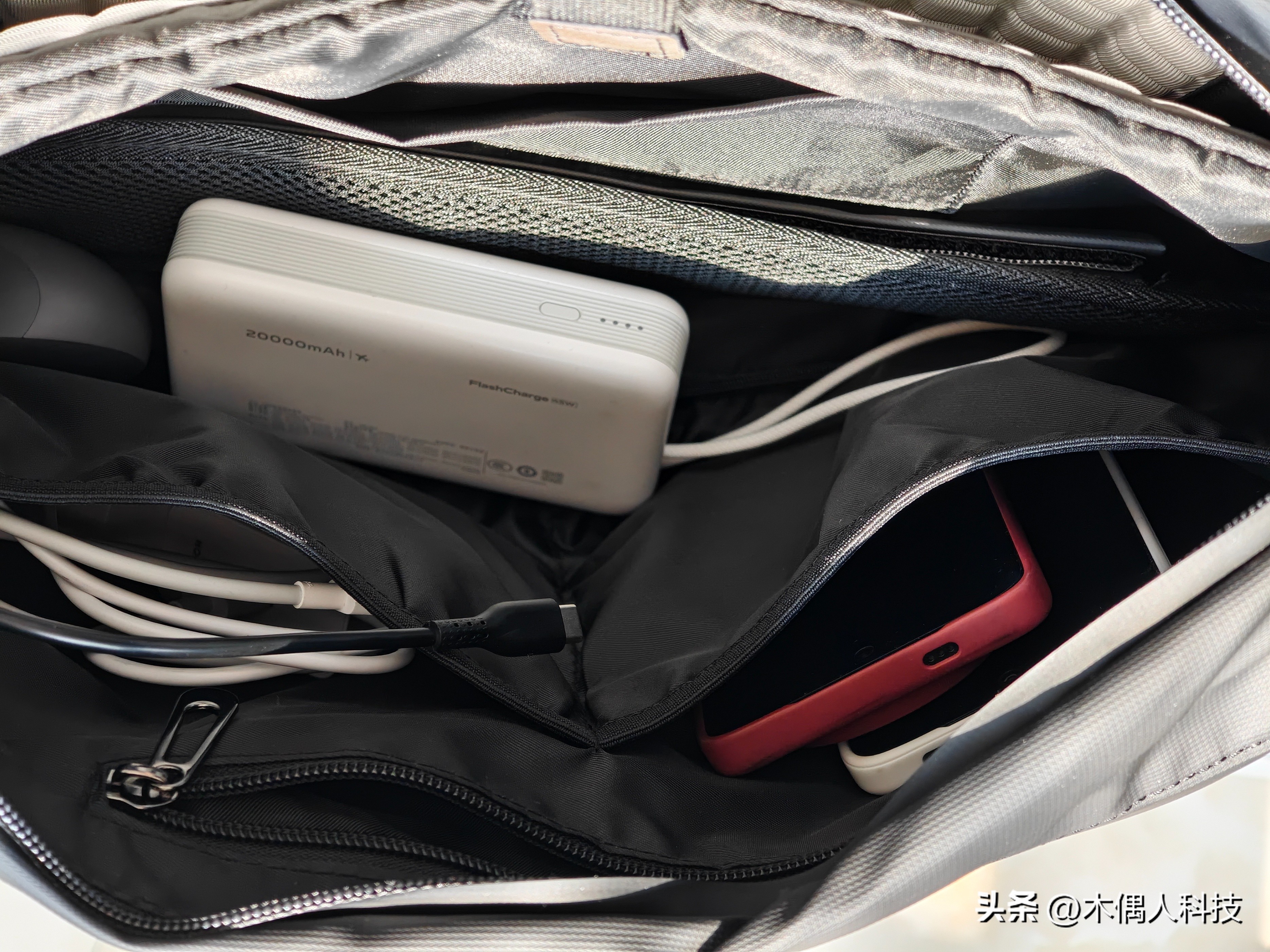 我的这款是加大号款,还有一个可拓展容量设计,拓展前容量在9升左右,拉开两侧的拉链就能拓展到16升左右的容量。包内有做非常合理的分隔层设计,多口袋的设计让小配件也不会乱成一团,方便取用。实测拓展后放下几台手机和一台笔记本电脑,再加上充电器充电宝以及一些常用的数码小配件都是完全没有问题的。在挎包内侧还有连接内外的30W快充接口,不用把充电宝一直拿在手上也能为手机补能,太适合经常在户外活动的朋友,方便快捷也不占地方!