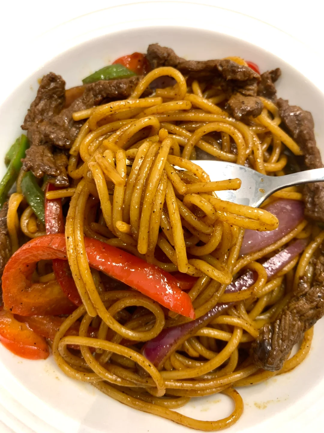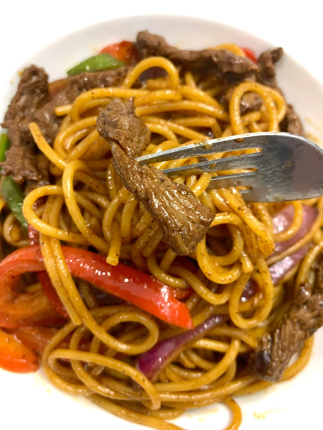[彩虹R][彩虹R]好久没吃意面啦,今天在家做了真的超级好吃!!和西餐厅的味道一样!干净卫生做法超简单[赞R][赞R]几分钟就能搞定 [放大镜R]食材:意面、牛肉、彩椒、青椒、洋葱 [放大镜R]做法: 1⃣️牛肉切条,加一勺生抽、一勺老抽和适量黑胡椒粉搅匀腌制10分钟 2⃣️调个料汁:2勺生抽➕一勺老抽➕一勺蚝油➕半勺黑胡椒粉 3⃣️水开煮意面,煮熟捞出过凉水 4⃣️油热下牛肉,滑熟捞出,另起锅烧油,下彩椒青椒和洋葱炒软,倒入牛肉和意面,加入料汁炒匀即可