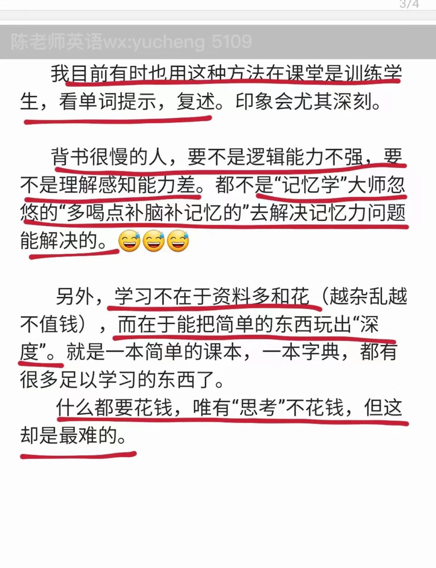 背书“一遍就过”的方法?1,分享我个人背书“一遍就过”的方法及课堂如何训练学生复述能力的。 2,词汇书学习以及文章阅读对于词汇学习的不同作用。 3,我只会教别人思考和系统学习,不会教“死记硬背”,不思考的学习,难以“长线”,因为会越来越累,背的会越来越多。