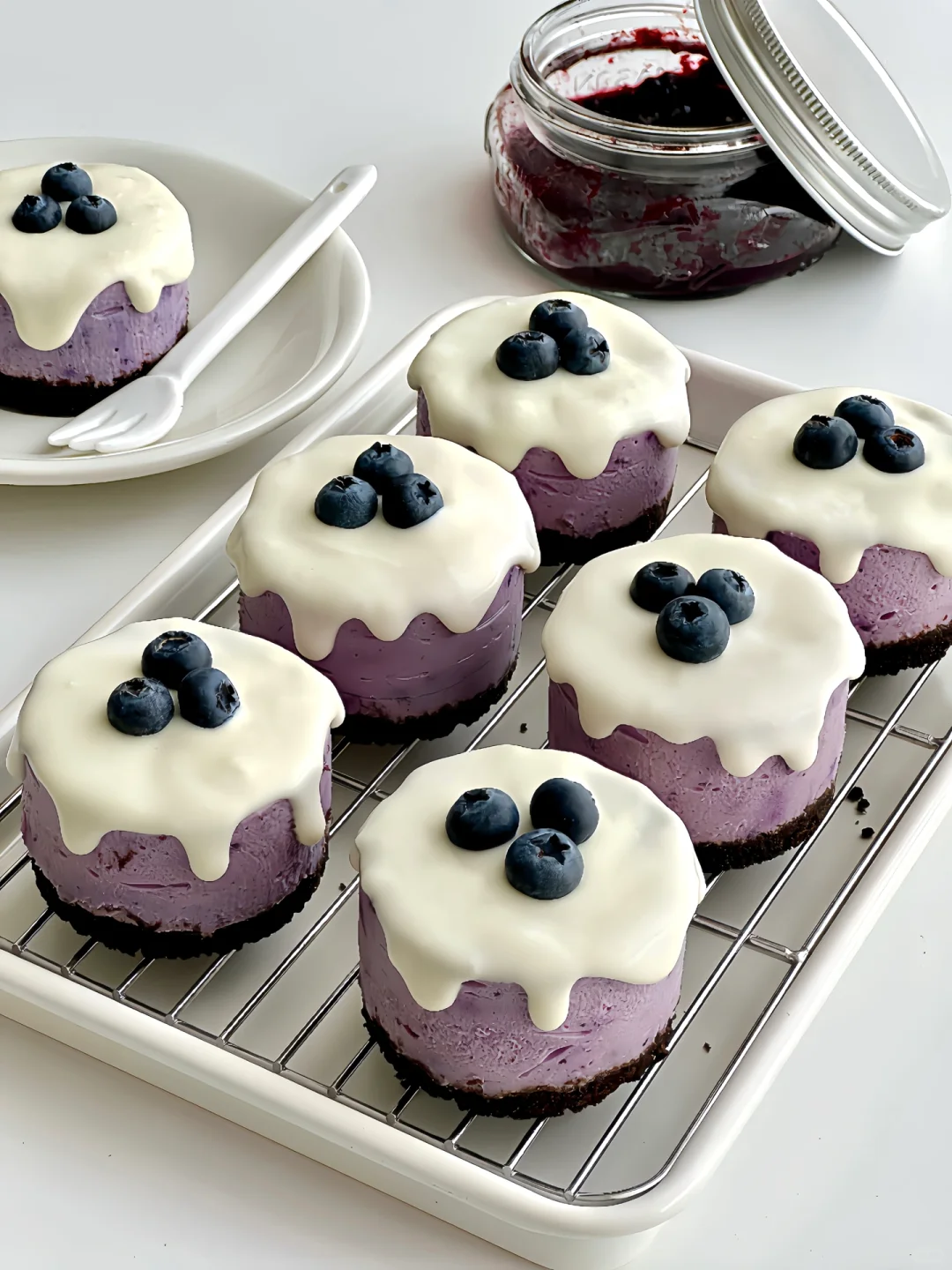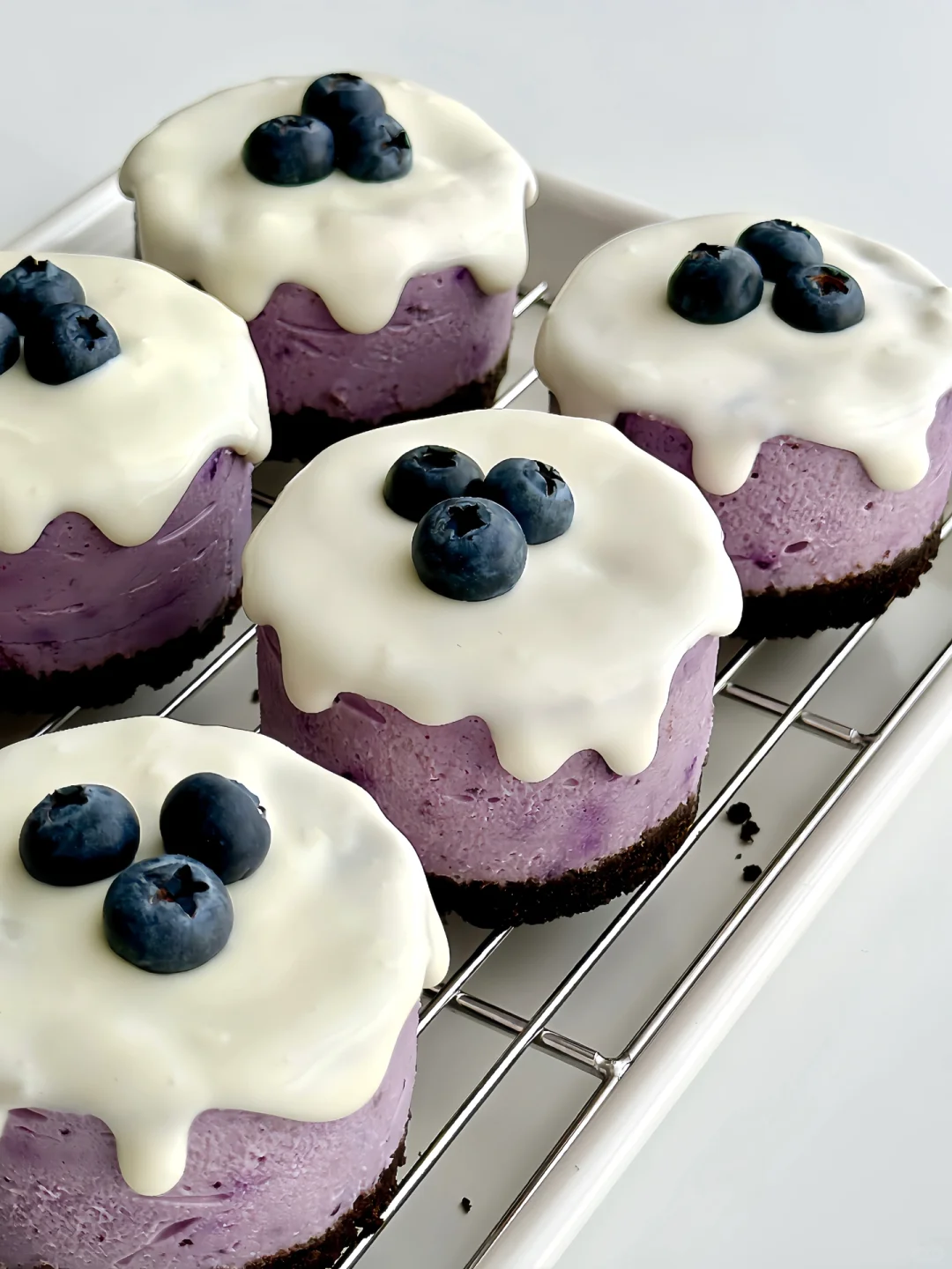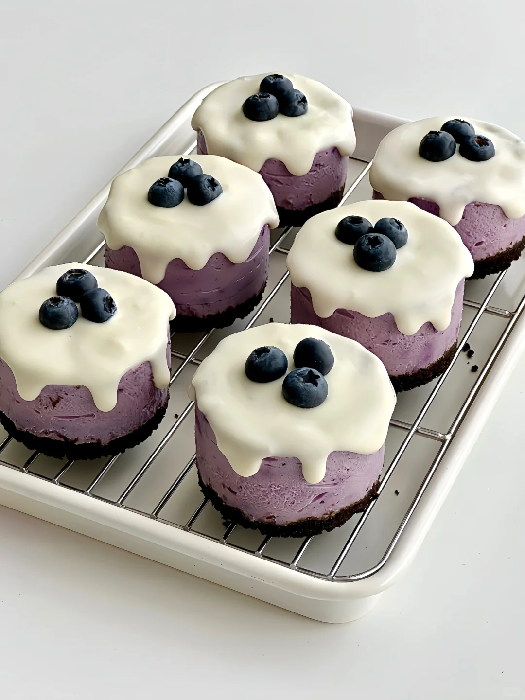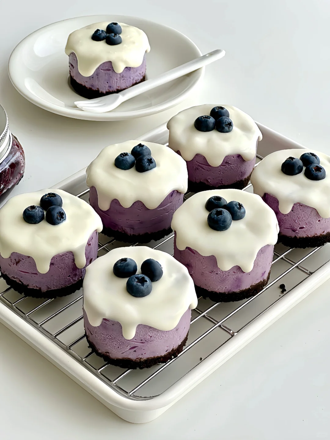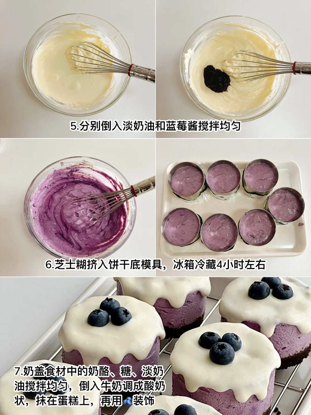 ❹倒入淡奶油混合均匀,再放入🫗蓝莓酱混合均匀,装裱花袋挤入饼干底模具,送入冰箱冷藏❄️4小时左右脱模