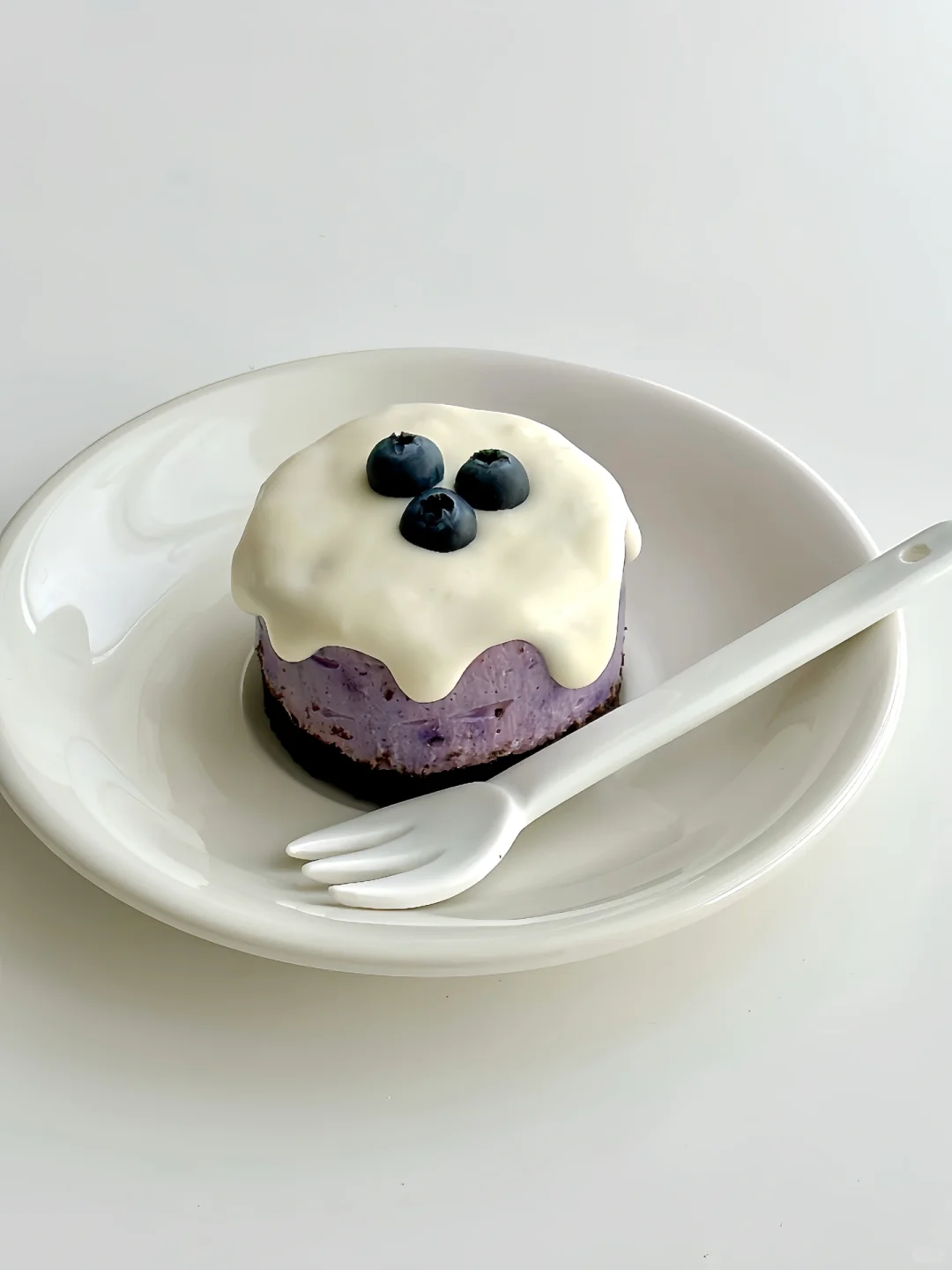 ❺奶盖食材中的奶油奶酪➕糖➕淡奶油混合均匀,再倒入适量牛奶调成酸奶状,抹在蛋糕上,然后用蓝莓🫐装饰即可