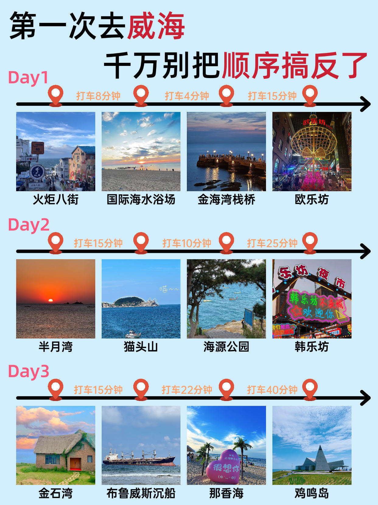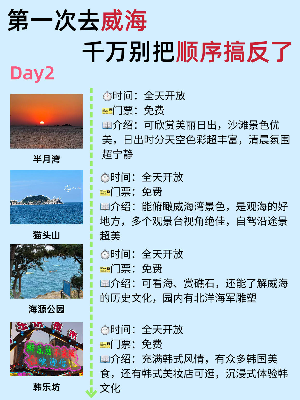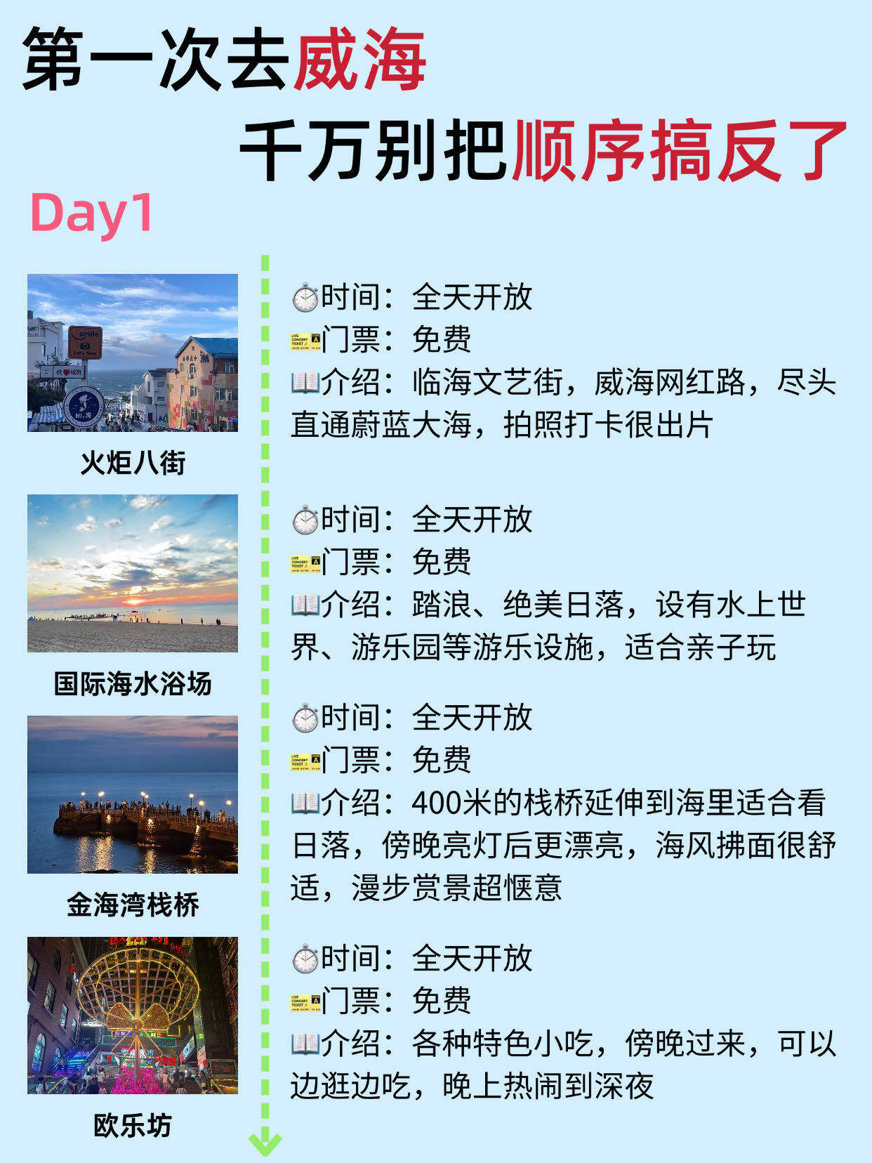 ✅威海三日游路线📍Day1:火炬八街→国际海水浴场→金海湾栈桥→欧乐坊📍Day2:半月湾→猫头山→海源公园→韩乐坊?