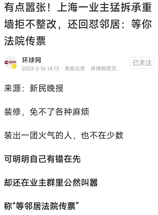 其他邻居担心住宅安全,在业主群里催促6楼业主及时整改,没想到6楼业主激化矛盾,说要业主去告他,他等法院传票!而且还要告张某私闯民宅! 目前,城管部门已经介入,并对此事进行了立案,有关工作人员表示,他们要求对方在2月底前,找有关专业机构把墙面恢复好,三月初的时候出具恢复报告。
