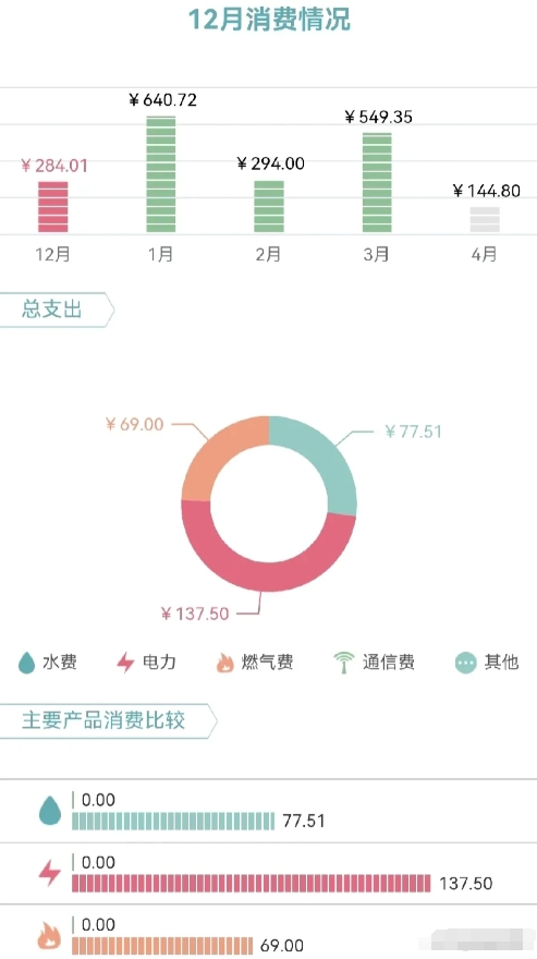 本人本来心里很淡定,但突然看到邻居反映的水费暴涨问题,也禁不住把最近几个月的水电煤气缴费记录翻出来查看(图2~图5),经过比对,近几个月水费(23年12月为77.51元,24年1月87.62元,2月无单,3月76.95元)比较稳定,应该没问题;