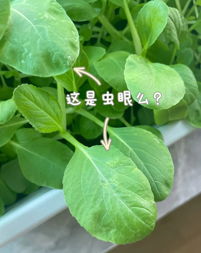 5.有没有虫子? 我在窗台种,只开了一个小口通风。偶尔会飞来一只不知名的虫子,搞走就完事,不是菜虫。但是有几片叶子好像有虫眼,看不见虫子,有没有小伙伴帮忙看看(图5)是不是虫眼啊?