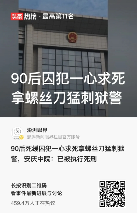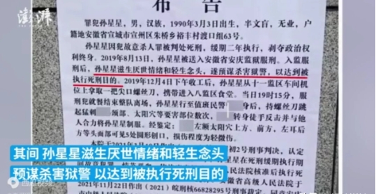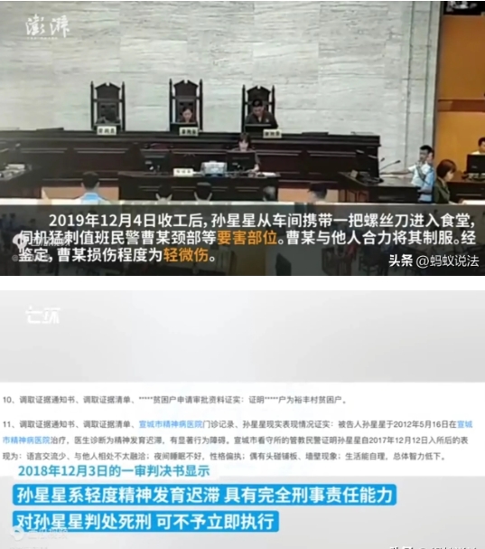 “死刑!”安徽安庆,一名被判处死缓的90后囚犯,在某监区车间顺了一把螺丝刀,并携带到监狱食堂,当日19:15分,服刑犯就餐离场,这名90后亦在其中,万万没想到,他突然绕到狱警背后,用螺丝刀猛刺其颈部、太阳穴等要害部位,后被狱警和众人合力制服! 男子孙某是一名90后,精神发育迟滞,有显著行为障碍,其父亲孙某松找村支书申请五保户,因不符合条件,遭到村支书李某拒绝,不料,孙某松认为李某故意刁难他,于是打电话给儿子孙某,希望孙某帮自己出气。 孙某接到父亲孙某松的电话后,气冲冲地赶到孙某松所在地,询问父亲怎么回事?谁欺负他了?孙某松再一次告诉孙某,称李某打他(实际上没有打),希望孙某去教训李某一顿,谁曾想到,孙某星竟持刀冲到对方家里,将李某杀害。 孙某主观上有杀人的故意,客观上实施了杀人的行为,刑法第232条规定,故意杀人的,处死刑、无期徒刑或者十年以上有期徒刑. 最后,一审法院,以孙某系精神病人,具有法定可以从轻情节,判了孙某死刑,缓期两年执行。 1、有网友表示不解,孙某系不是精神病人吗?为什么还要负刑事责任? 刑法第18条规定,精神病人在不能辨认或者不能控制自己行为的时候造成危害结果,经法定程序鉴定确认的,不负刑事责任。 换而言之,精神病人只有在不能辨认或者不能控制自己行为时犯罪,才不负刑事责任,并非任何时候均不负刑事责任。