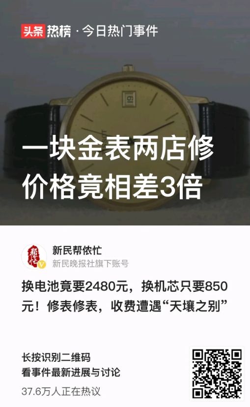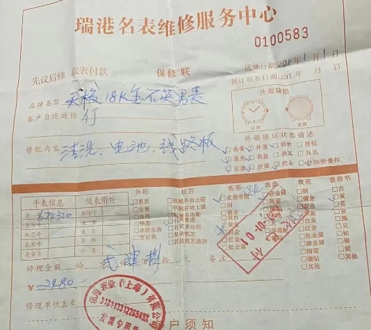 上海徐汇,范老伯有一块石英机芯天梭金表,两年前电池用尽,停了,于是到某名表维修店更换电池,一共花了2480元。两年后电池再次用尽,老伯意识自己被骗,便找到名表维修店。万万没想到,对方竟觉得理所当然,还说商场里的东西,肯定比普通饮食店要贵些。 范老伯的天梭石英表,是他1997年去香港游玩的时候,在香港购买,范老伯非常喜欢,2020年,也就是23年后,天梭表电池用尽,范老伯到某名表维修店更换电池。 在范老伯看来,更换电池最多也就几百块的事情,但名表维修店检查后表示,更换电池虽然只要300元,但老伯手表的线路板,可能被电池漏液污染,需要更换线路板、还要清洗和加油,算来下差不多要3000元。 范老伯觉得这价格太贵了,不想换了,后在名表维修店的话术下,老伯通过讨价还价,最后以2480元的价格,更换了手表电池。 2年后,老伯天梭表电池再次耗尽,这一次,他找了另一家名表维修店换电池。对方检查后告诉老伯,“你的表有点特殊,除电池、清洗加油之外,还要更换机芯、功能调校、修复防水性能等”,老伯听对方说了一大串,心里一凉,这要多少钱啊。 工作人员表示,机芯是进口部件,他们要从瑞士调货,可工作人员开出的总价是850元。老伯当时怀疑自己听错了,我换这么多东西,一共才850元吗?我上次只是换块电池,对方收了两千多。 直到此时,老伯才意识到自己被骗了,于是找到之前换电池的维修店,希望对方能给个说法。