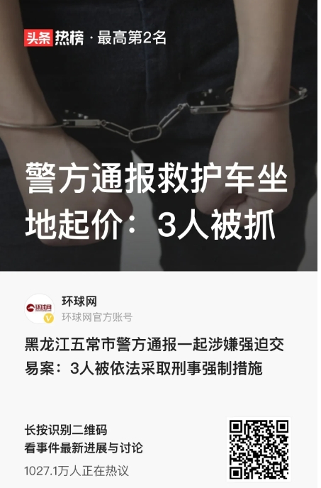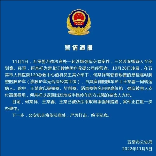 “令人发指!”黑龙江哈尔滨,一女子不想母亲在重病监护室去世,于是花1200元喊了一辆救护车,准备将处于弥留之际的母亲送回家里,万万没想到,救护车开到半路,竟坐地起价,要求女子支付4600元,女子不同意,司机强行将其拖拽下车! 近日晚上,重症监护室的医生,给张女士带来了一个不好的消息,他们已经尽力了,张女士像天塌了一样,眼前一片灰暗,随后张女士和弟弟商量,不能让母亲在医院去世,要将母亲接回家。 两人达成一致意见后,拨打医院电话,希望医院安排一辆救护车送母亲回家,可接线员回复说,他们医院的救护车,夜间不出市区,要次日早上6点后才能出车。张女士非常着急,母亲现在的状态极其不好,随时有可能撒手而去,哪里等到的明天早上呢? 接线员见张女士焦急,便提议说,他可以找到其他的救护车,可能价格要略微贵一点。张女士仿佛抓到救命稻草一样,询问接线员介绍的司机,55从里行程,大概要多少钱?司机回复说,不超过1200元,听到这个价格,张女士松了口气,便答应下来。 然而,救护车开出哈尔滨市区,进到荒郊野外后,救护车上身穿护士服的女子,开始询问张女士母亲的病情,张女士以为对方是出于好心,关心自己。后来才知道,她想让自己租用她们的呼吸机,2500元一天,随后又有些其他费用,加起来要4500元一天。 张女士觉得价格太高了,接受不了,女子便拿出计算器,计算救护车费用,杂七杂八一加,竟要4600元之多!