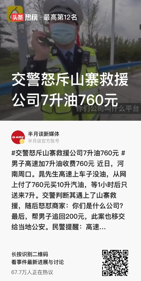 河南周口,一男子开车上高速,却因忘记加油,“趴窝”在高速路上,着急之下,男子拿出手机,在网上找了个救援平台,并支付了760元买了10升汽油,万万没想到,救援人员只送了7升油过来,并表示爱要不要!760元只有这么多! 事发这天,晁先生开车出趟远门,或许是因为着急的缘故,他忘了看汽油油表,等仪表盘显示车辆缺油时,晁先生已经开车上高路了,他希望车辆副油箱的油量能坚持到加油站,可天不遂人愿,晁先生的车最终抛锚在高速上。 随后,晁先生通过手机,在网上找到一个救援平台的电话,他们可以将汽油送上高速路,只是价格有点贵,10升汽油要760元,此时晁先生已经无计可施,只好忍痛下单,等了一个小时,救援人员终于将汽油送到晁先生车辆“趴窝”的地方。 看到救援人员的车辆到后,晁先生松了口气,可看到他们送来的汽油,却傻了眼,他支付了10升汽油的钱,救援人员只送了来7升汽油,而且还是你爱要不要的态度。晁先生没有办法,打落了牙混血吞,同意把7升汽油加到车里。 最后油是加了,可晁先生的气,一直没消,他开到服务区后,向交警投诉。随后,交警非常霸气的拨通了山寨救援的电话,并在怒骂山寨救援队后,帮晁先生讨回了多收的3升汽油钱。