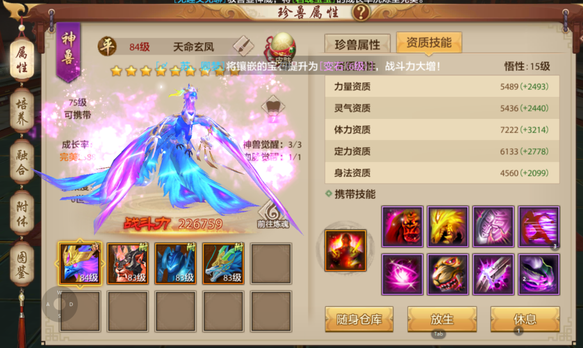 高操作远程输出,其身法之灵活,迎刃有余=解除所有技能cd 单体控制揽雀尾,范围散工,有输出有控制,团战压点必备,投入需求4颗星。