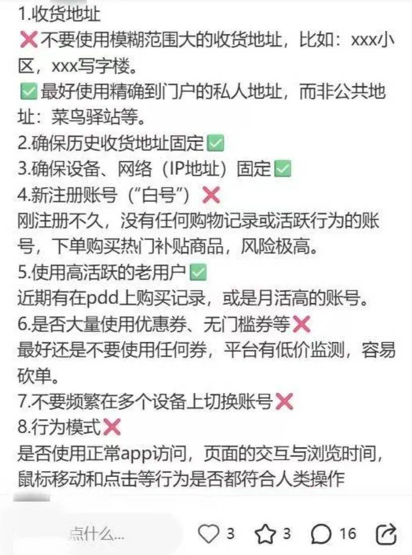 01 防黄牛成了“用户行为审判”如何使用拼多多百亿补贴成功购买苹果新机,几乎已经成为了社交平台的某种“规则怪谈”。在消费者总结的“防砍单教程”中,可以看到从收货信息,到IP地址,再到日常操作的行为模式,每个购物细节都需要谨慎操作,即使这样也无法保证成功购买,只能降低被砍单的概率。