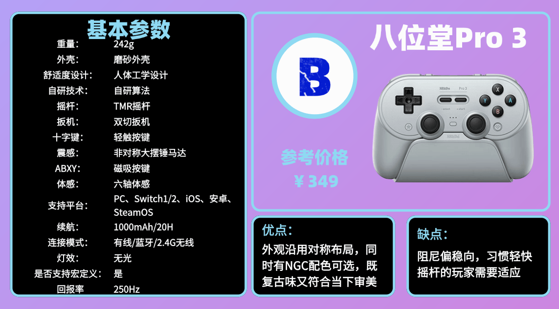 (2)使用体验上偏实用、易上手,支持三模连接,并能一键唤醒Switch 2,多设备切换非常便捷;非对称震动配合多指位设计,在动作和体感游戏中更沉浸。续航方面1500mAh属于中规中矩,一场长游戏或连续几晚娱乐都能满足。机身稍重,但带来的稳固感让操作更稳定,不过长时间握持对小手玩家可能略有压力。