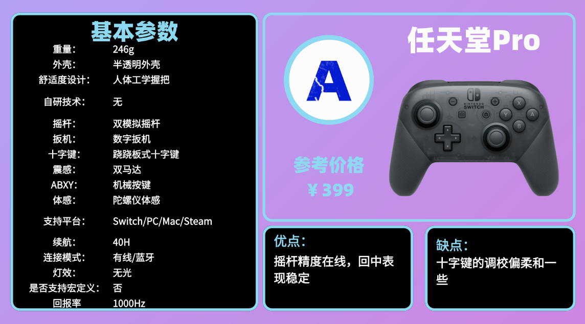(2)作为Switch官方生态的一员,它在适配与连接体验上优势明显:连接快速、回连稳定、延迟控制优秀,几乎不用担心兼容问题。同时支持蓝牙连接PC与Mac,Steam环境下识别顺畅,拓展性不错。续航方面表现依然强势,单次充满电大约能坚持40小时左右,哪怕高频游玩也很少会有“续航焦虑”。