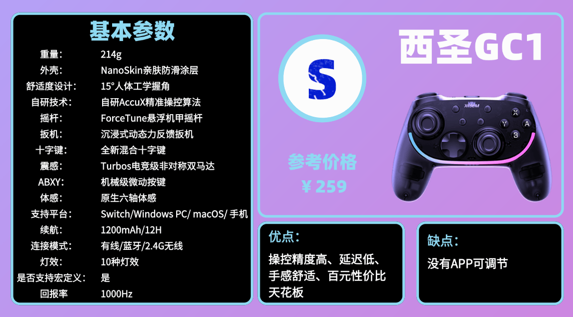 (5)配置方面,西圣GC1同样诚意满满。它搭载电竞级极速连接引擎,支持2.4G、蓝牙和Type-C三模,输入延迟低至0.5ms,连接稳定、操作顺畅;原生六轴体感精准捕捉旋转、倾斜、挥动等动作,射击和赛车操控更稳;214g轻量化机身+15°握角+NanoSkin亲肤防滑涂层提供舒适贴合握感;半透明幻雾晶透机身+10种 RGB灯效模式兼顾科技感与视觉沉浸;全平台兼容,无论手机、PC还是Switch都能轻松畅玩。综合来看,这套配置在百元价位中非常罕见,性价比十足。