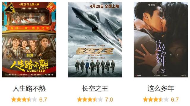 值得一提的是,在豆瓣网上,目前已经有部分五一档新片的评分出炉了,其中《长空之王》豆瓣7.0分,《人生路不熟》豆瓣6.7分,《这么多年》豆瓣6.7分。