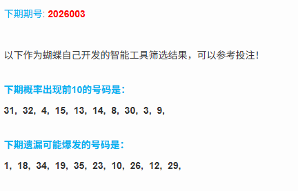 本期分析:本期的冷热分布,本期的遗漏大于9的号码有9个,上期的冷码开出了1个号码,温码开出了3个号码,上期热码开出了1个号码,本期来看,热码是需要防一下的,近期的热码是有机会开出2到3个号码的,冷码依旧不会太多,考虑1个号码即可,温码考虑2到3个号码。(热码:蝴蝶算法中概率前10的号码,只有10个;冷码:遗漏大于等于9的号码;温码:排除前2类之外的剩下的号码,都是温码;)
