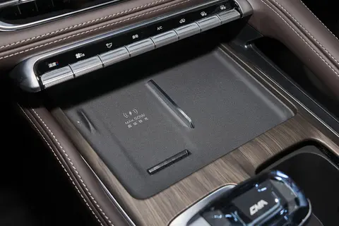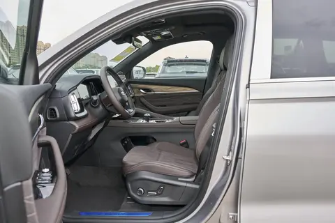 转到车身侧面,贯穿式腰线从车头一直延伸到车尾,勾勒出很强的力量感,车窗框加入的镀铬装饰条提升了精致度,让侧面看起来不单调。20英寸的轮毂尺寸与车身比例搭配得恰到好处,没有为了追求视觉效果而牺牲实用性,日常行驶的舒适性和通过性都有保障。新车还新增了莫高蓝、丹青两款全新车色,我试驾的莫高蓝实车特别有质感,阳光下能呈现出细腻的层次感,低调中透着高级,比常见的黑白灰更有个性。