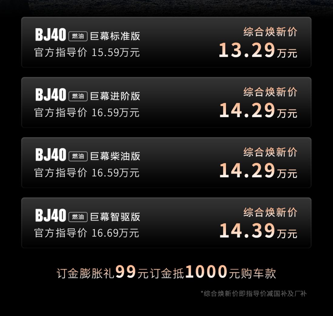 BJ40燃油巨幕版把价格打到了13.29万起,却塞进了双15.6英寸悬浮屏和二代8155芯片。用官方的话说,“15万的价格,50万的越野实力,百万级的舒享配置”。博格华纳TOD智能四驱系统让新手也能轻松越野,四目行车记录仪时刻守护车辆安全——这明显是想吸引那些想要越野能力又舍不得科技体验的年轻用户。
