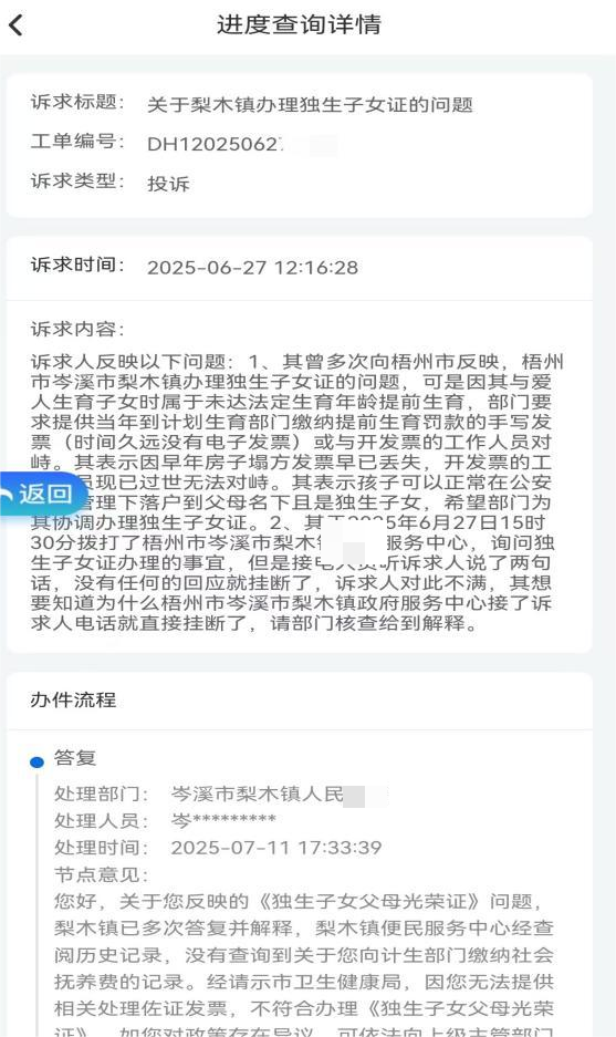面对办证僵局,近年来,廖先生已多次向岑溪市及梨木镇相关部门提出办证申请,均因无法提交当年的缴费票据而被拒绝。此外,廖先生对基层沟通态度也表达了不满。他举例称,2025年6月27日下午致电梨木镇相关部门服务中心咨询时,电话接通后仅说了两句话即被挂断,未获任何答复或办理指引。