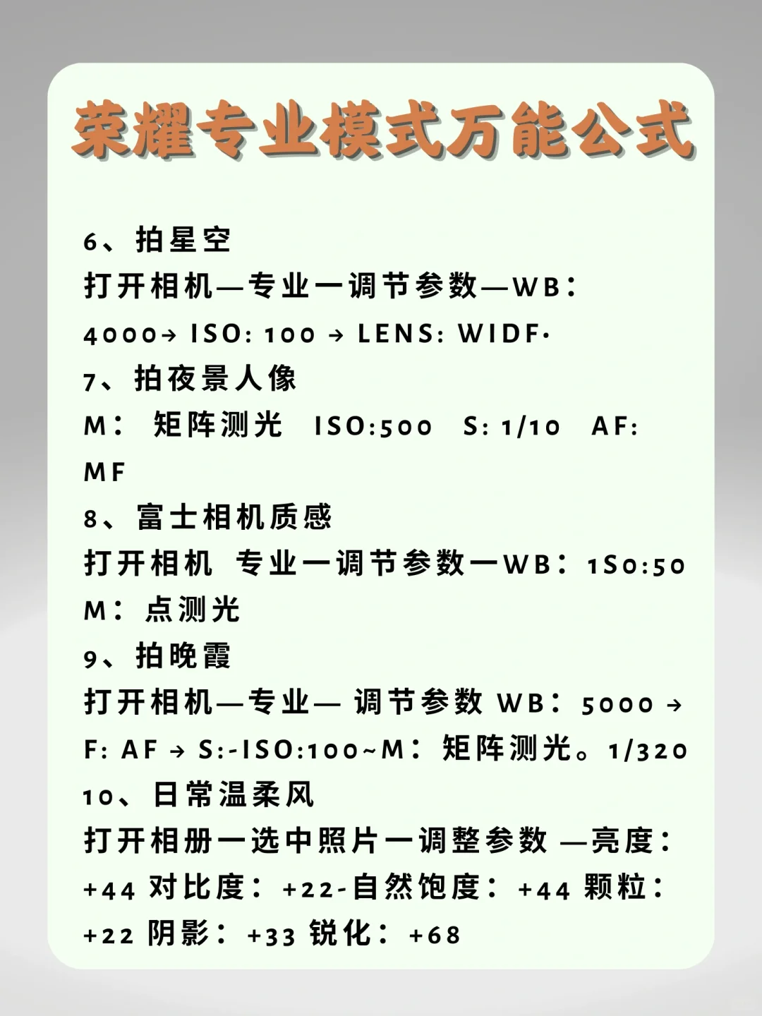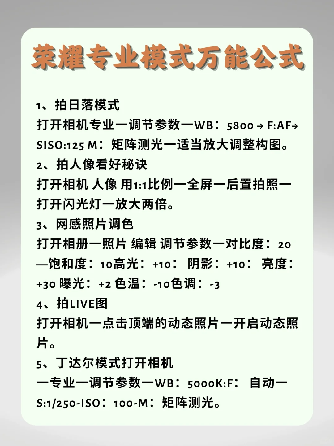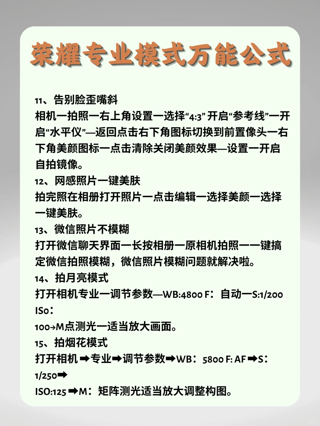 1、拍日落模式 2、拍人像好看秘诀 3、网感照片调色 4、拍live图 5、拍丁达尔效应 6、拍星空 7、拍夜景人像 8、富士相机质感 9、拍晚霞 10、日常温柔风 11、告别脸歪嘴斜 12、网感照片一键美肤 13、微信照片不模糊 14、拍月亮 15、拍烟花[蹲后续H][蹲后续H][蹲后续H]