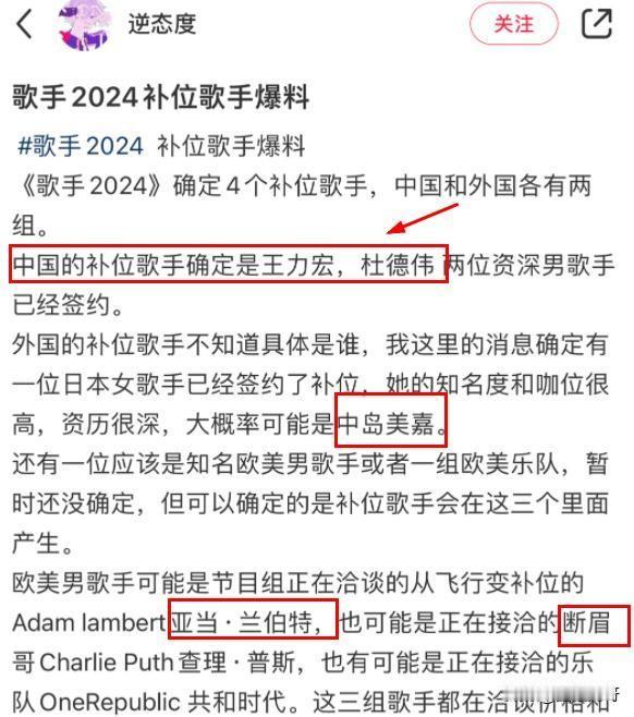 真的假的?网传《歌手2024》补位歌手里有王力宏、杜德伟、中岛美嘉、亚当、断眉跟共和时代,目前节目组正在洽谈中,要是真如此,那不得神仙打架呀。