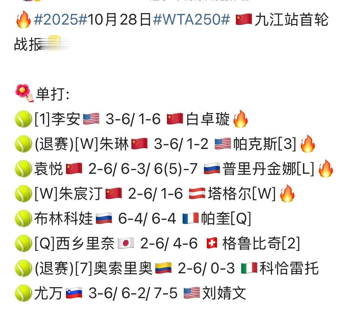 WTA250九江站女单首轮最新战报⬇️9、❎外卡选手中国朱琳3-6、1-2伤退,3号种子美国帕克斯晋级;