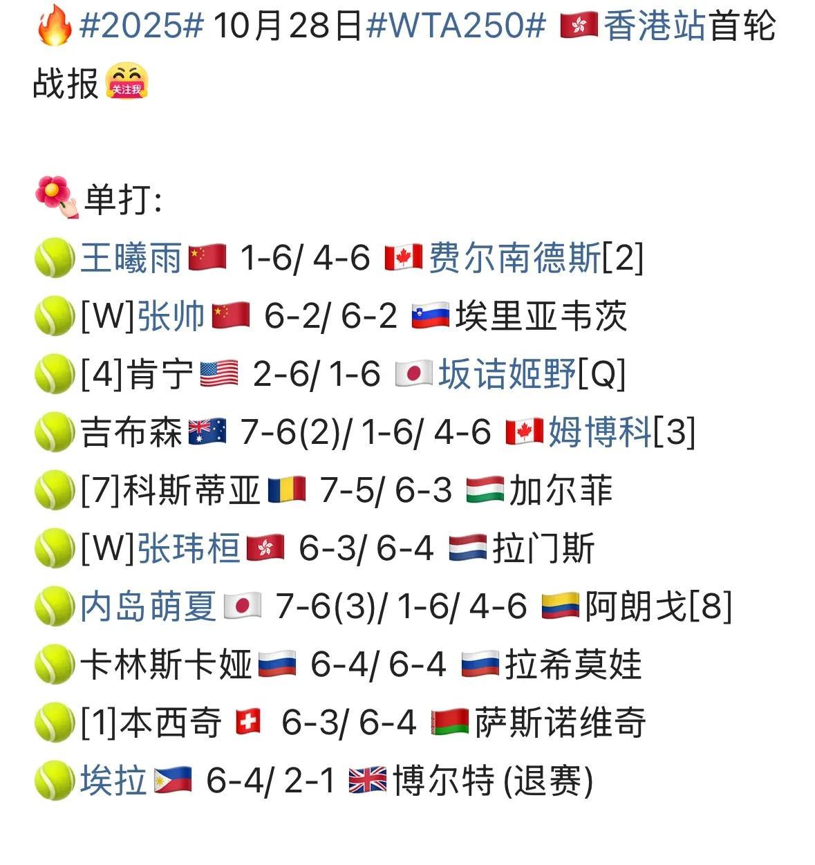WTA250香港站女单首轮焦点战报⬇️7、❎中国王曦雨1-6、4-6不敌2号种子加拿大费尔南德斯;