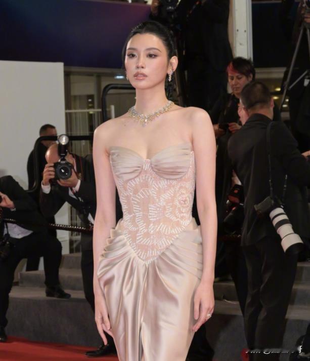 赌王儿媳就是不一样!35岁奚梦瑶高调现身戛纳红毯,一身香槟色礼服抹胸裙尽显贵气,