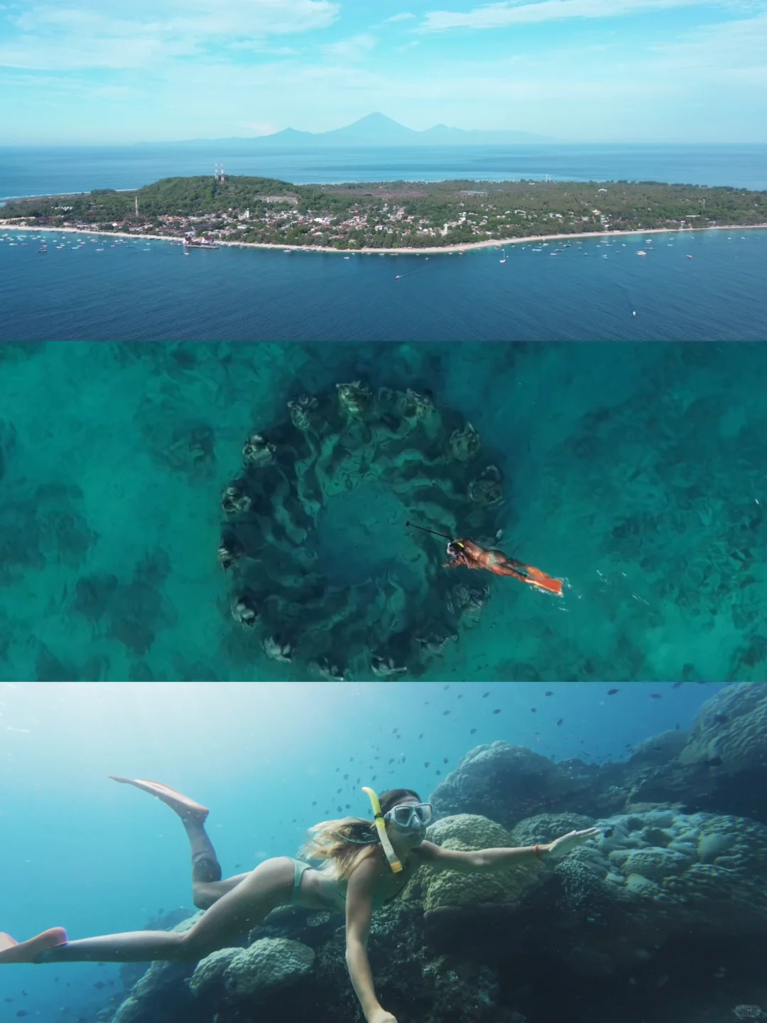 🌟Gili是浮潜宝地,可以看到著名水下雕塑和五彩珊瑚礁。建议清晨时间出海,能收获5个无人打扰的潜点!9点后去,浮潜就会变成下饺子了😅