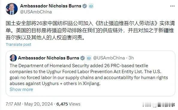 伯恩斯造谣中国!事实上,美国劳工目前还在被当做奴隶使唤! 就在今天!美国驻华大使伯恩斯在外媒平台上发文, 美国国土安全部将26家中国纺织公司列入《维吾尔族强迫劳动预防法》实体名单。 伯恩斯进一步强调,美国的目标是我们的供应链中不存在强迫劳动,并对侵犯人权的行为追究责任。 事实上,美国彭博社5月11日发表题为《美国企业从未放弃强迫劳动》的报道,披露了美国政府和企业如何利用囚犯进行强迫劳动,为企业和政府创造收入。 彭博社报道里提到,美国有80万囚犯工人,他们每年创造的价值高达100亿美元,其中超过20亿美元是为监狱系统外的客户服务。 然而,许多囚犯称他们是被迫劳动,该情况与现代奴隶制无异。 中国政府有没有强迫新疆维吾尔族同胞劳动,作为驻华大使的伯恩斯常年在中国,可以抽空到现场看看。没经过实地考察,就在那满口胡说八道。 伯恩斯还是多关心一下美国人权问题吧,这可是全球最知名的资讯公司,而且还是一家美国公司,美国彭博社总不会造谣抹黑自己国家吧?