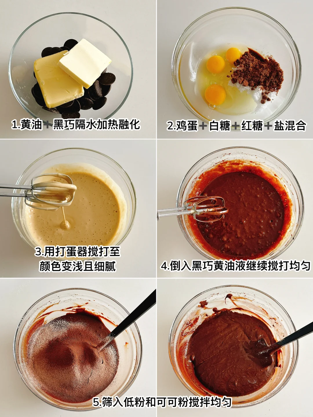 ❷白糖、红糖、鸡蛋、盐混合,用打蛋器搅打至颜色变浅且细腻