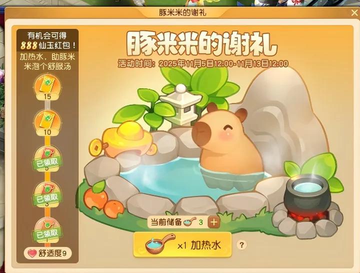 还有怎么白嫖仙玉红包?超简单,每天做日常任务太清符有10就可以领个热水,上线有个热水,然后逛下锦衣还有个热水,或者用霓裳积分换热水,给豚米米添水攒舒适度。