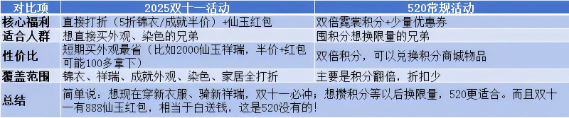很多兄弟纠结520和双十一这两活动选哪个,其实核心区别特别明显,直接上对比: