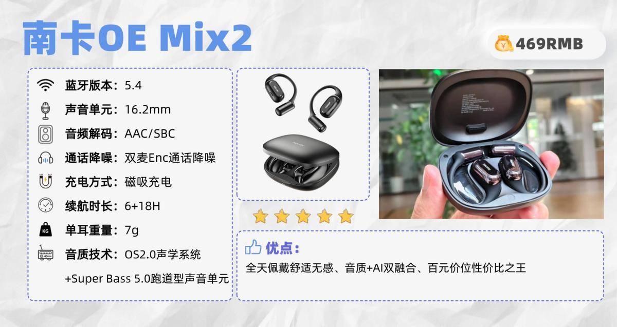 南卡作为开放式耳机领域的佼佼者,综合实力方面也是没得说,是目前开放式耳机里最佳产品之一。OE Mix2在配置方面也是进行了全面升级,采用最新的蓝牙5.4芯片,对比一般的蓝牙芯片,性能方面有质的提升。还拥有双麦ENC通话降噪功能,即便是嘈杂的环境下,依旧能够保持清晰自如的交流。6+18H超长续航,轻松使用一整天,IPX5防水,运动的时候使用也不怕流汗干扰。AI智能功能,让耳机不仅仅能够听歌,更是贴身智能助理。各方面的配置都远超同类竞品,甚至可以媲美千元旗舰款式!