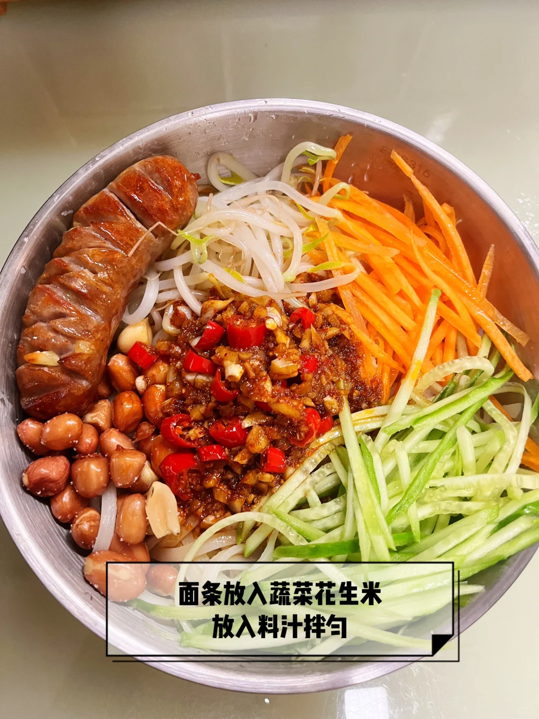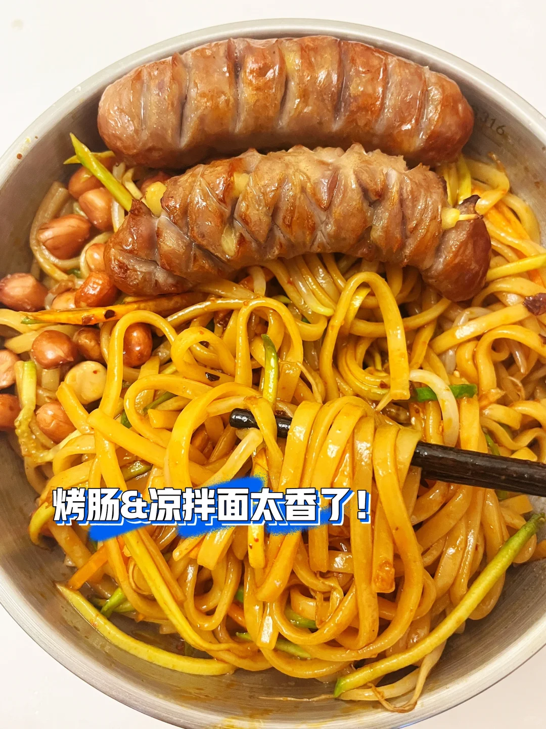 夏天没有胃口可以试试这个凉拌面[哇R][哇R] 做法简单方便,搭配上一根多汁烤肠简简单单一餐真的太幸福了[飞吻R][飞吻R] 最近朋友推荐入手了民俗源民俗源黑猪肉爆汁烤肠[吧唧R] 口感微微带一点甜真的巨好吃,还有松子肉肠也很好吃,喜欢吃烤肠的姐妹可以试试!!
