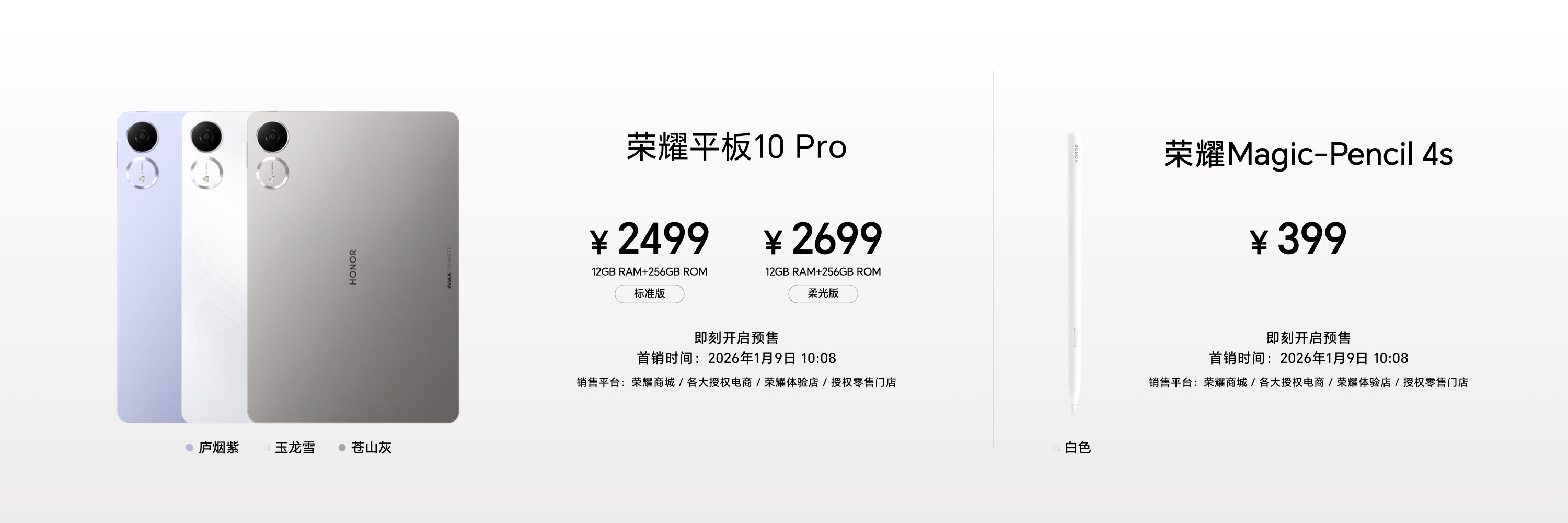 荣耀平板10 Pro于1月9日10:08全渠道正式开售,12GB+256GB标准版售价2499元、12GB+256GB柔光版售价2699元,全新手写笔荣耀Magic-Pencil 4s售价399元;此次将所有配置都升级为新春礼盒套装,12GB+256GB礼盒版现价2499元,12GB+256GB柔光礼盒版现价2699元,购买即赠荣耀Magic-Pencil 4s手写笔;荣耀平板X10 Pro于1月9日10:08全渠道正式开售,8GB+128GB版本售价1499元、8GB+256GB版本售价1699元、8GB+256GB柔光版售价1899元。