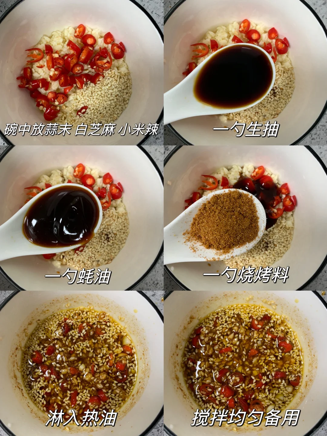 1⃣️调个料汁:碗底放蒜末、白芝麻、小米辣,加一勺生抽、一勺蚝油、一勺烧烤料,淋入热油,搅拌均匀备用