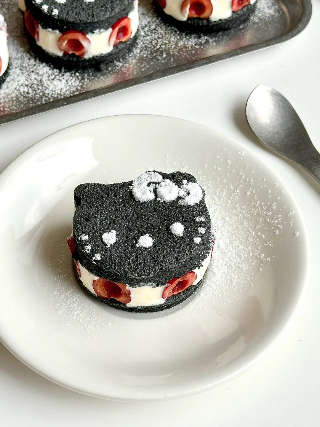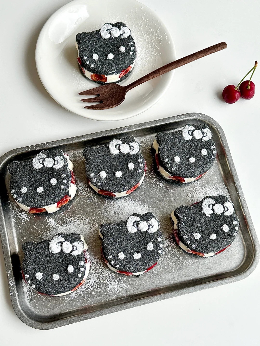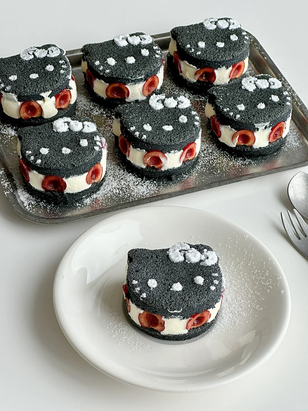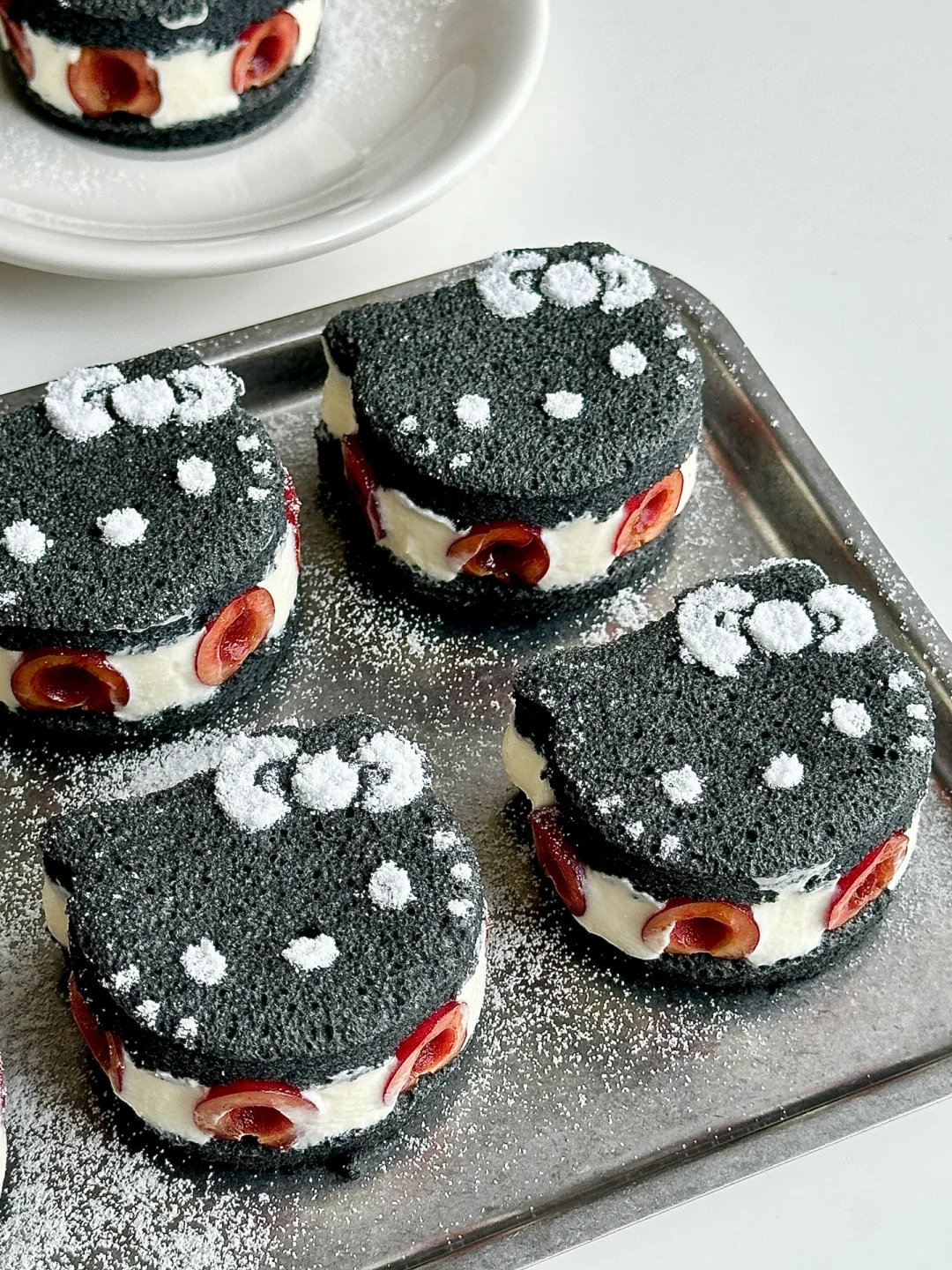 ❹夹心奶油食材打发,模具里放一片蛋糕,摆上樱桃,挤入奶油,再盖上一片蛋糕
