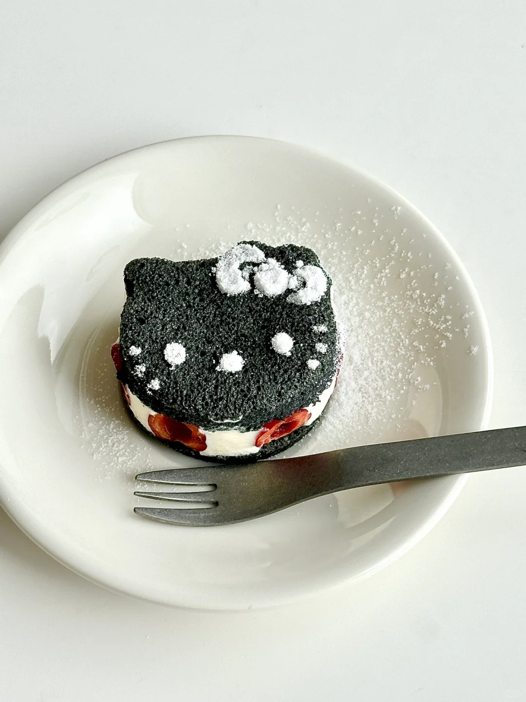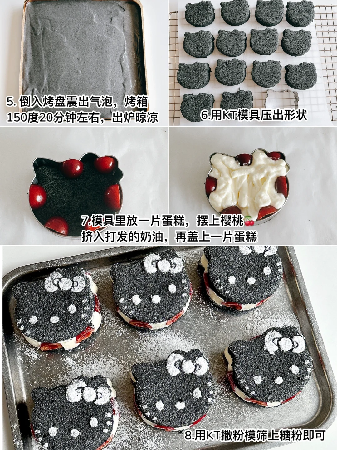 ❸取1/3蛋白霜与面糊翻拌均匀,再倒回🫗剩余的蛋白霜中继续翻拌均匀,倒入烤盘,入烤箱150度♨️20分钟出炉晾凉,然后用kt模具压出形状